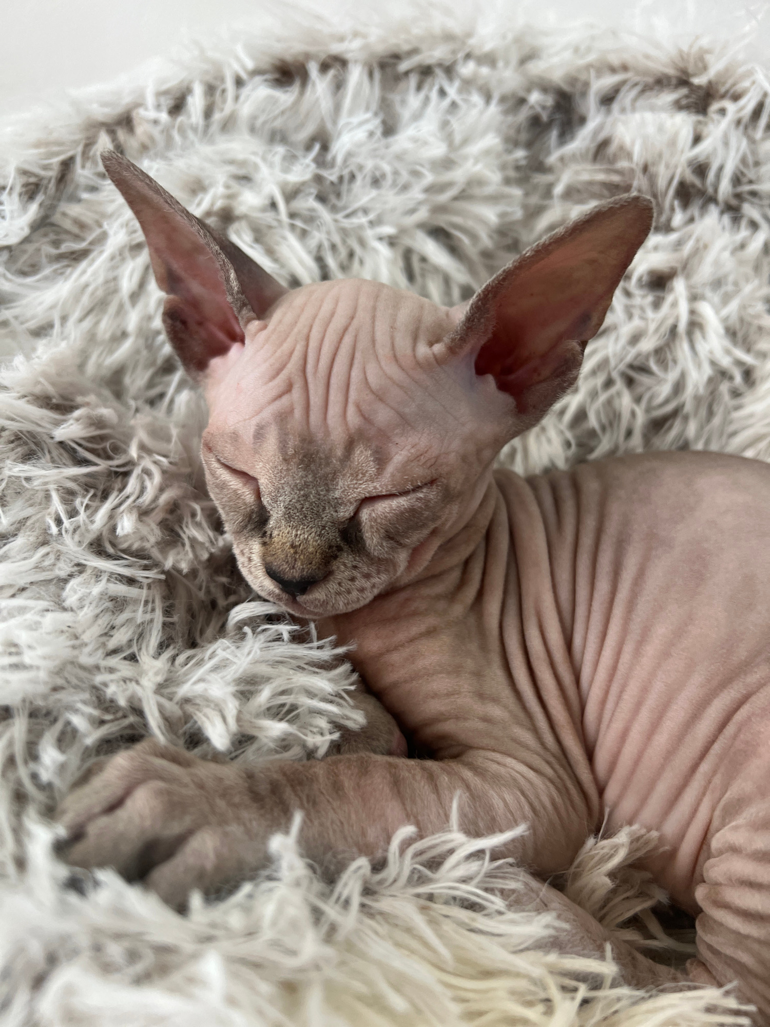 A close-up, top-down image depicts a hairless Sphynx cat, light pinkish-beige in skin tone with visible wrinkles, asleep on a shaggy, light-colored faux fur blanket. The cat's eyes are closed, and itsβ¦read more