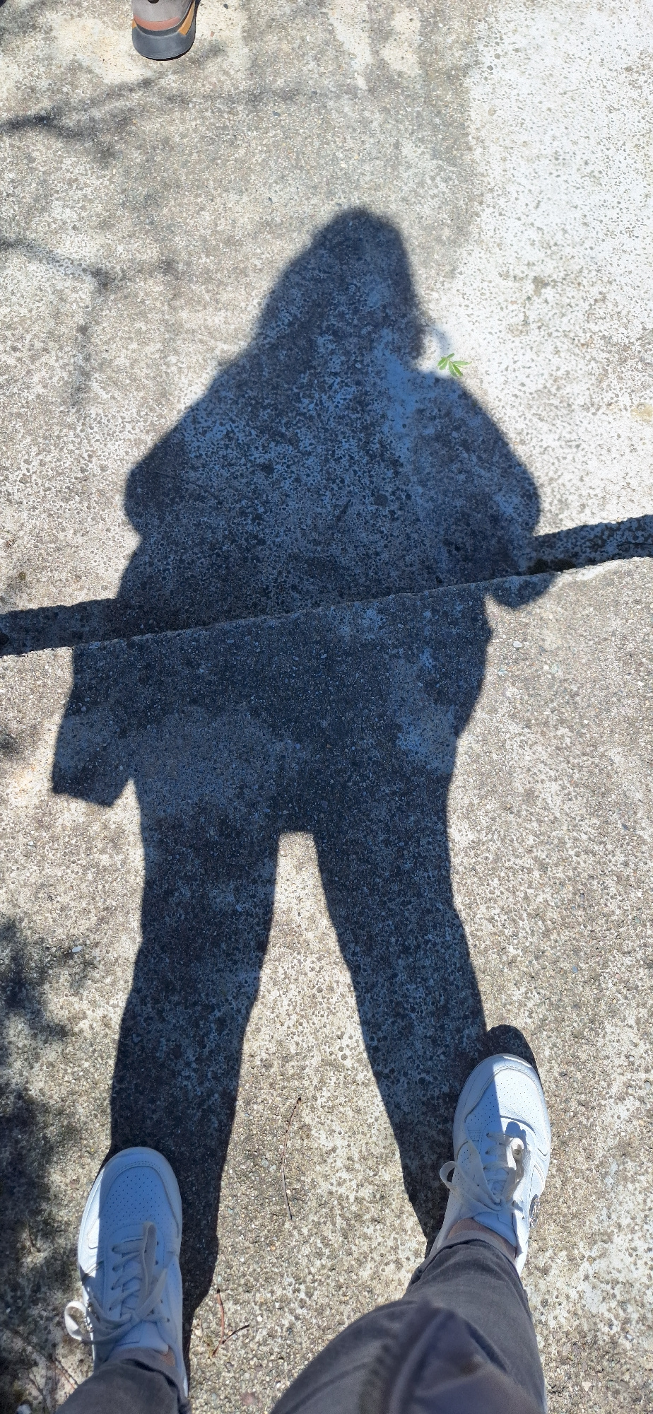 The image depicts a person's shadow cast on a concrete surface, likely a sidewalk or paved area. The person is wearing white sneakers and grey pants. The shadow suggests they are standing with their lā¦read more