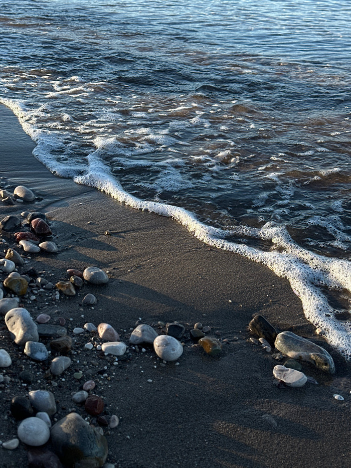 The image depicts a natural shoreline located in Šušanj, Montenegro. The upper right portion of the frame shows a body of dark, rippled water, exhibiting deep blue-grey tones. A distinct, curvilinear…read more
