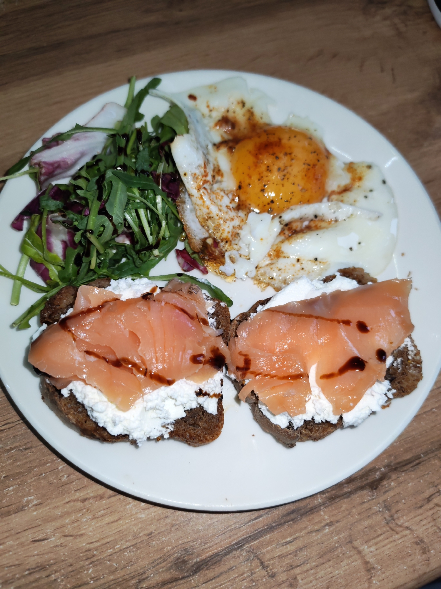 On a white plate, a meal is presented against a wood-grain surface. The meal consists of two open-faced sandwiches featuring dark bread, a layer of white cheese (possibly ricotta or cream cheese), and salmon slices drizzled with a dark sauce. Next to the sandwiches is a small salad of mixed greens and red leaves, also drizzled with the same dark sauce. A fried egg, seasoned with pepper, is positioned on the other side of the plate. No people are visible in the image. The location in Izhevsk, Russia, is unknown from the visual information provided. | Open Wire
