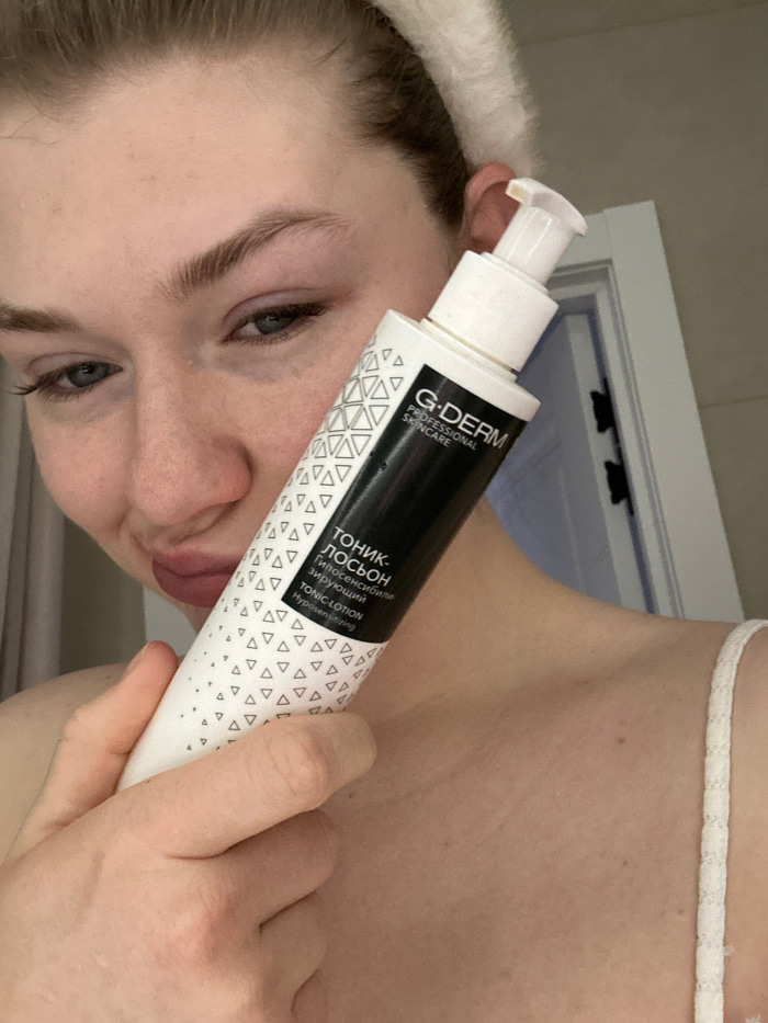 A woman holds a white bottle of G-Derm Professional Skincare Tonic Lotion. The bottle is white with a black section bearing the brand name and product information in Russian and English. The text incl…read more