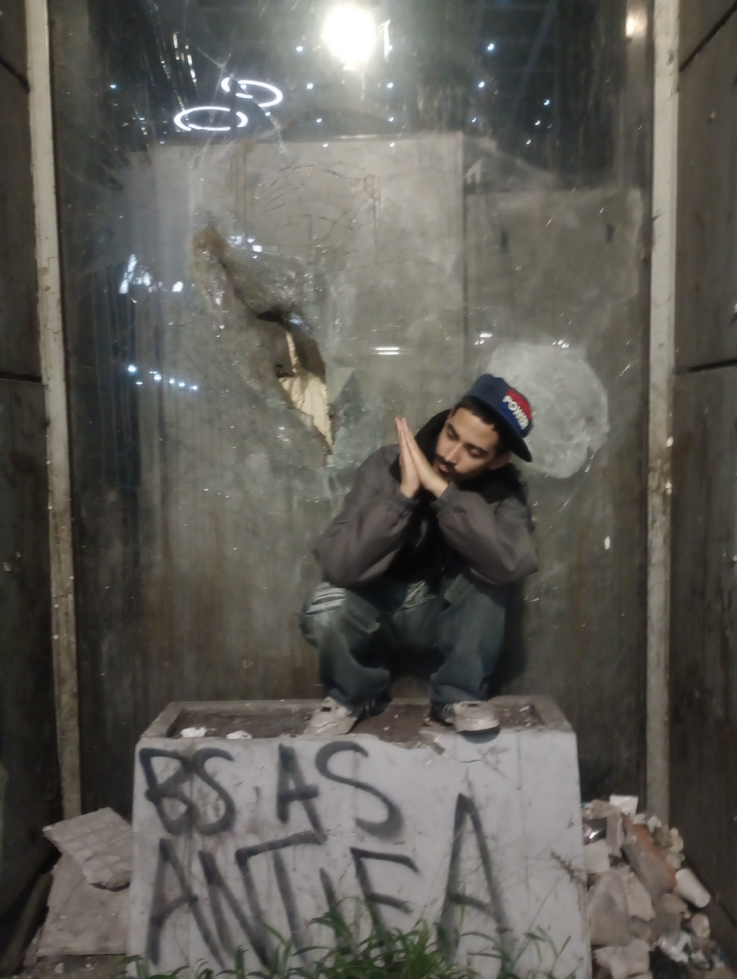 A man wearing a blue "POWER" baseball cap, grey jacket, and jeans is crouched near a shattered glass surface. He has his hands folded as if in prayer or resting his head on them. Next to him, there is…read more