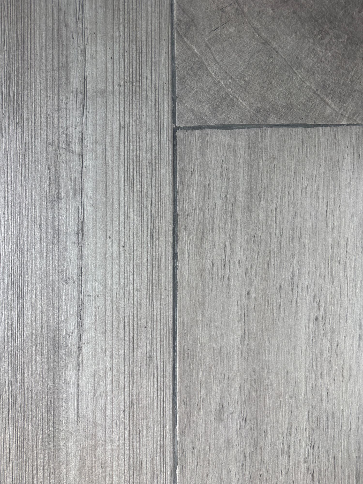 The image shows a close-up view of gray-toned, rectangular flooring tiles. The surface appears to be textured, with a pattern resembling wood grain on two of the tiles and a diagonally-oriented, textu…read more