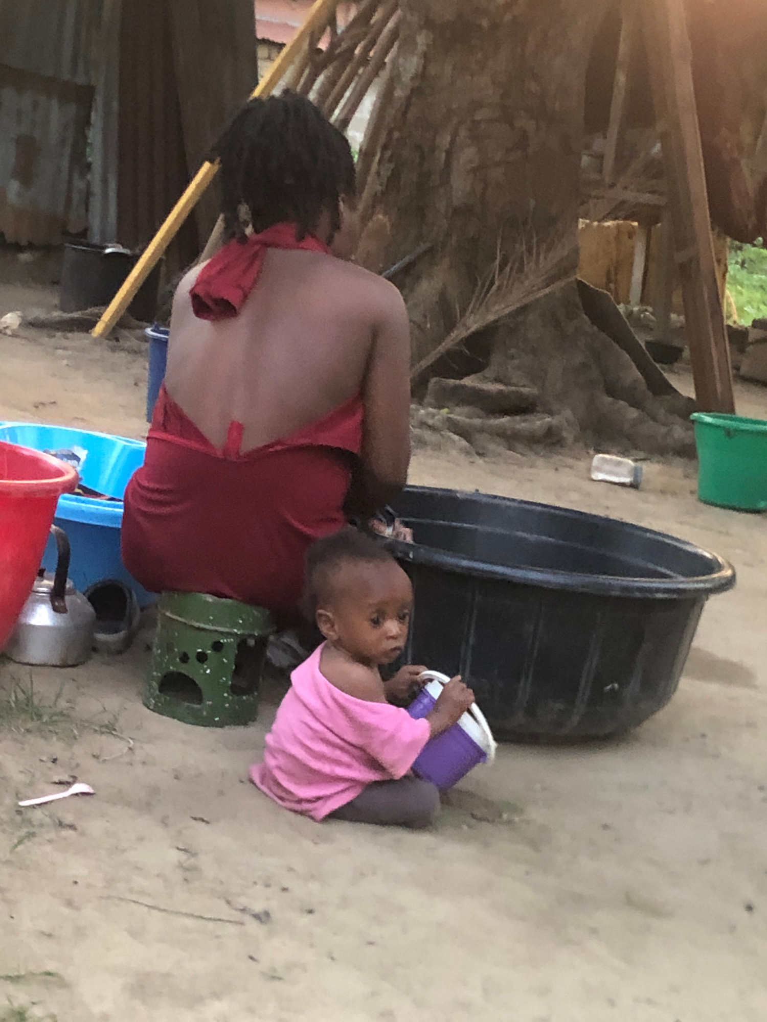 The image shows a woman sitting outside on a blue plastic stool. She has her back to the camera and is wearing a red dress. Beside her is a child wearing a pink shirt, lying on their back, and holding…read more