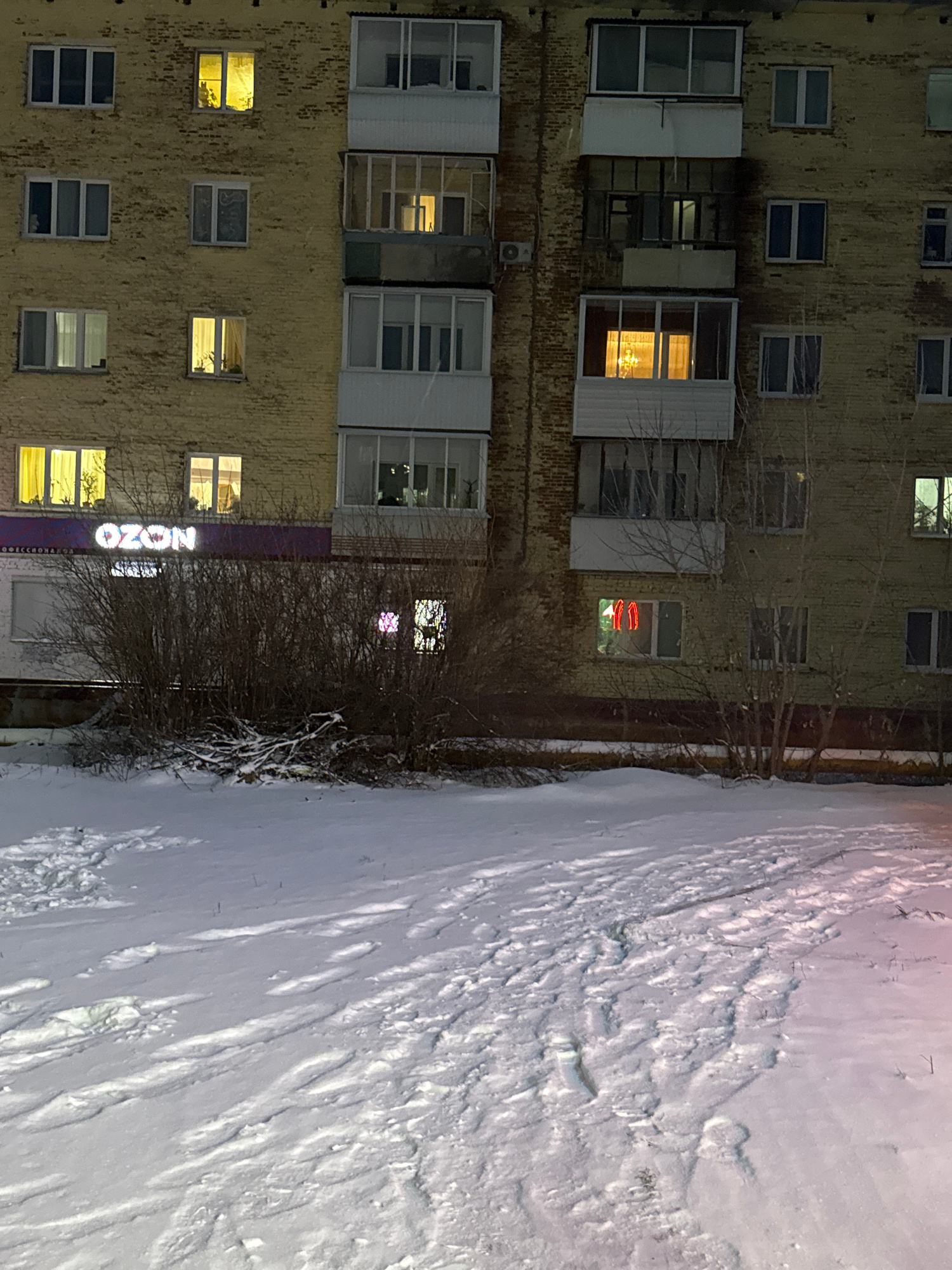 The image shows a winter scene in Votkinsk, Russia, at night. A multi-story brick building is on the left, with several lit windows and some windows with closed blinds or open balcony doors. An "OZON" sign, vertically oriented, is attached to the building. Adjacent to the building is a snow-covered area, with visible tracks and patterns in the snow. A small tree or bush grows between the building and the snowy area. | Open Wire
