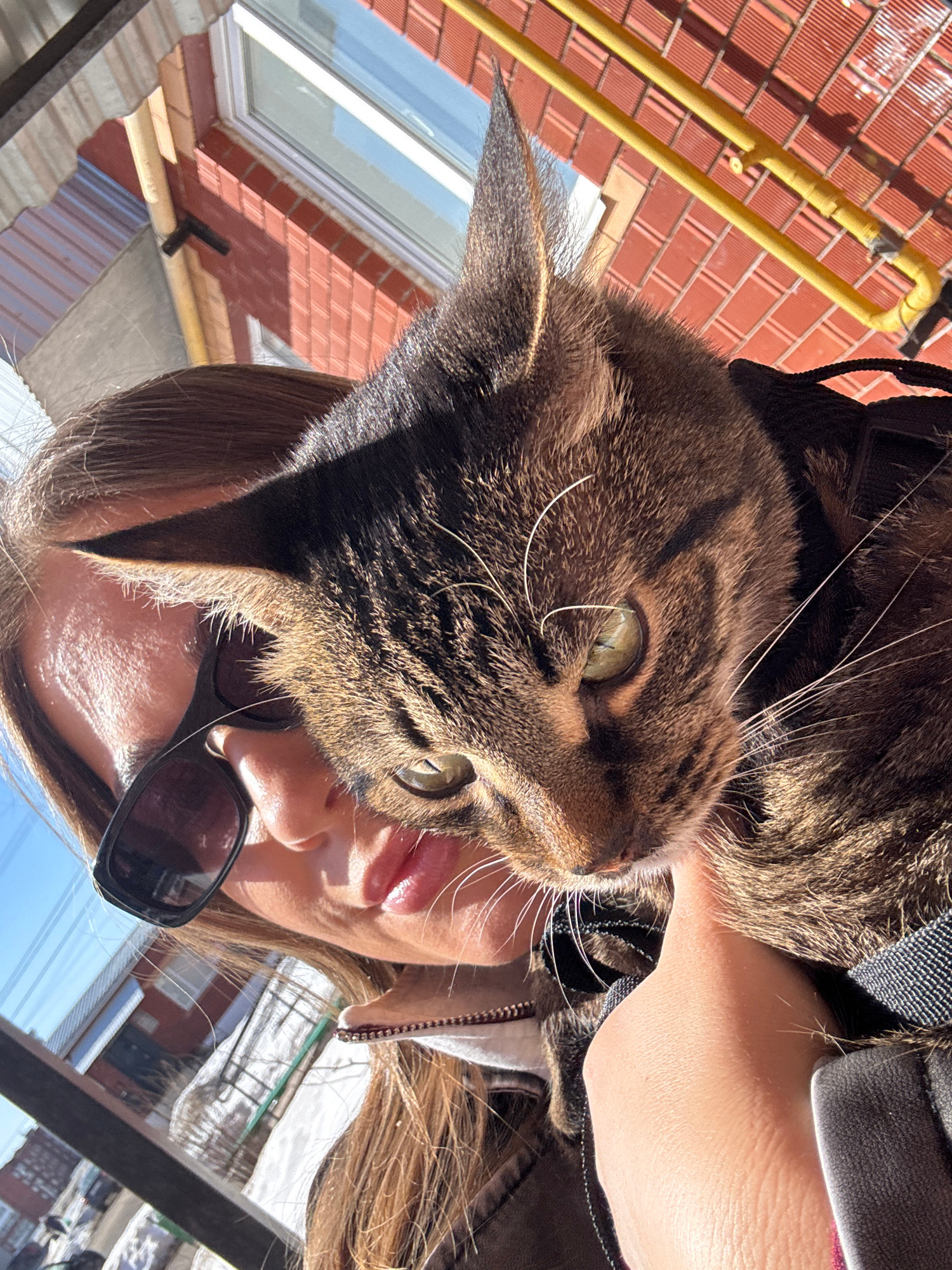 A selfie features a woman wearing sunglasses with a tabby cat strapped to her chest in a carrier. The background shows a red brick building with a white-framed window and yellow pipes running along thβ¦read more