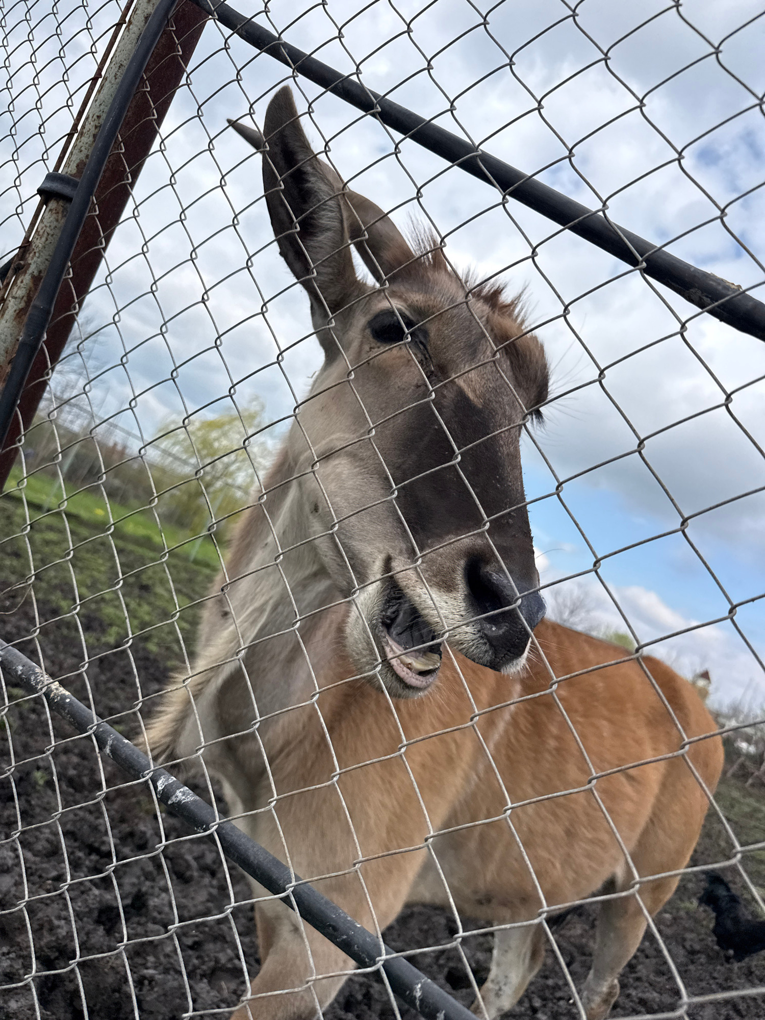 A medium close-up, low-angle shot depicts a young deer behind a metal wire fence. The deer, with its light brown fur and darker brown face, is facing upwards and slightly to the left, with its mouth o…read more