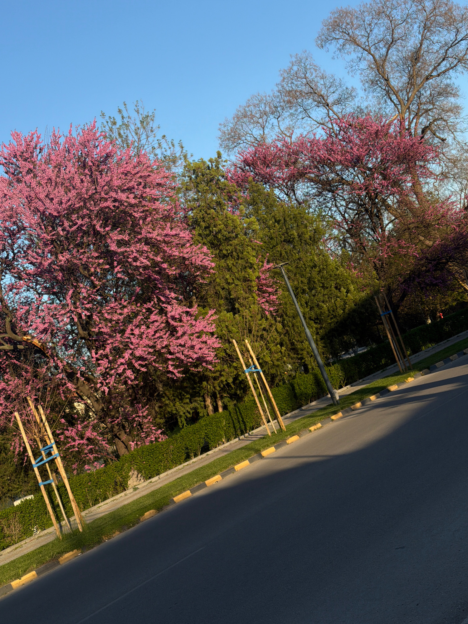 The image depicts a street scene in Septemvri, Bulgaria. On the left side, trees with pink blossoms are visible, interspersed with green foliage and some bare branches. A blue sky is partially visible…read more