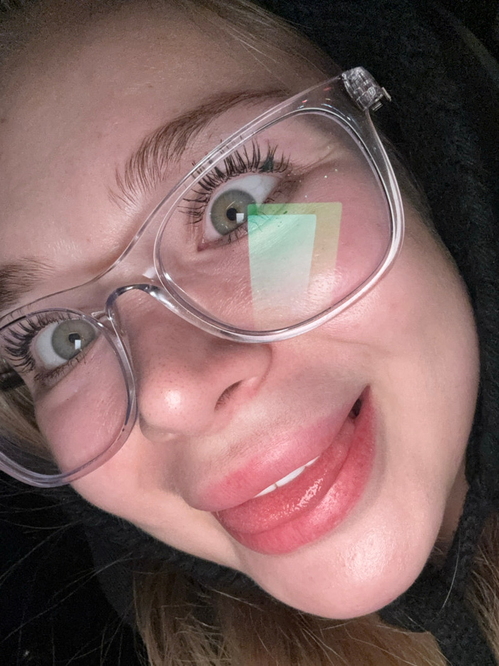 A close-up, rotated perspective of a person wearing transparent glasses. The glasses reflect a rectangular green and yellow light. The person has light skin, full lips with shiny pink lipstick, and gr…read more
