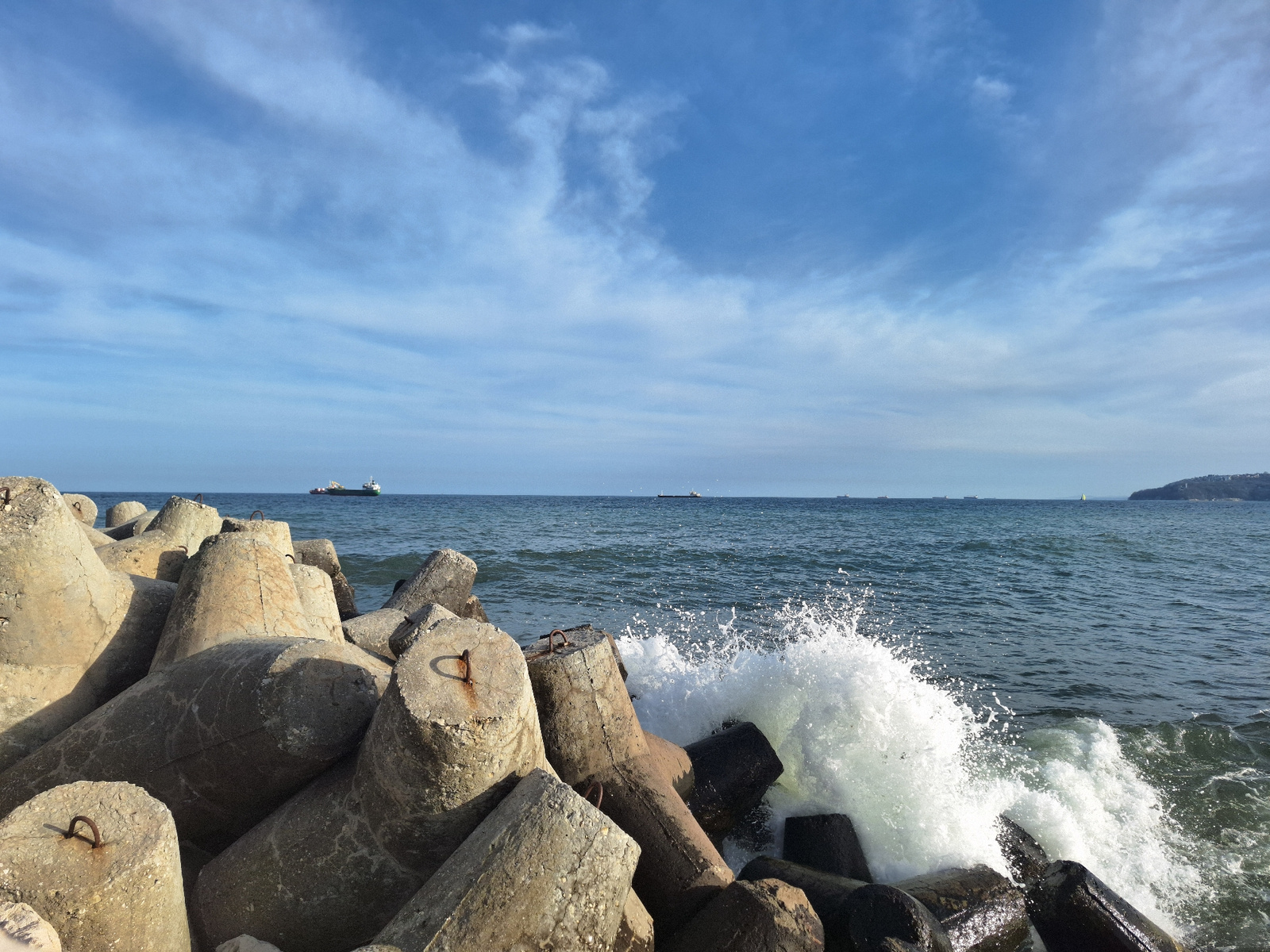 The image depicts a coastal scene in Varna, Bulgaria, with large concrete tetrapods forming a breakwater. Waves crash against the tetrapods, creating white splashes. In the background, the sea stretch…read more