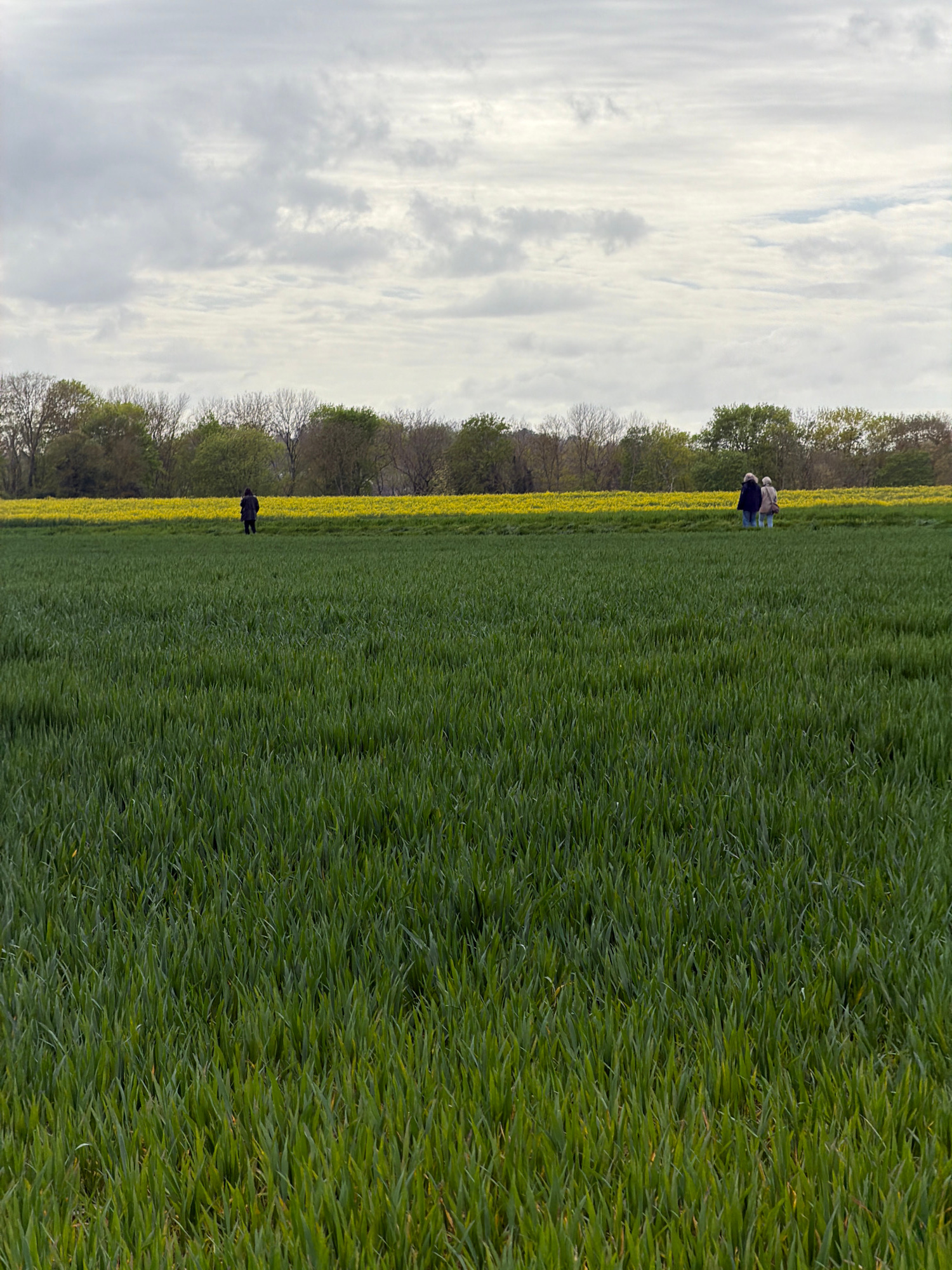 The image shows a landscape in Auvers-sur-Oise, France. A field of green wheat is visible, bordered by a strip of yellow rapeseed flowers and a line of trees. Two figures are present. One is at the lo…read more