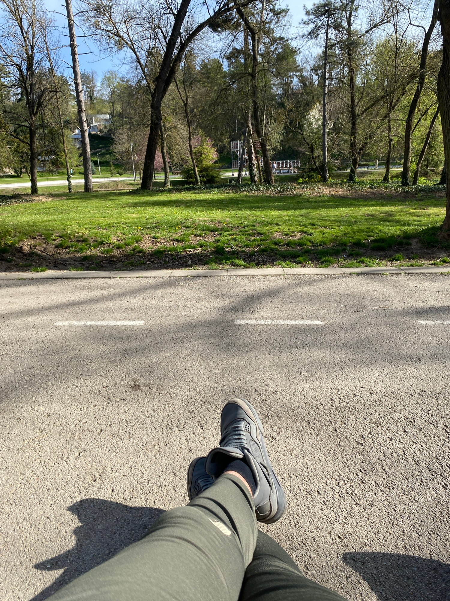 The image displays an outdoor scene from a first-person perspective, rotated 90 degrees clockwise, in Dobrich, Bulgaria. In the immediate foreground, the lower legs and feet of a person are visible, c…read more