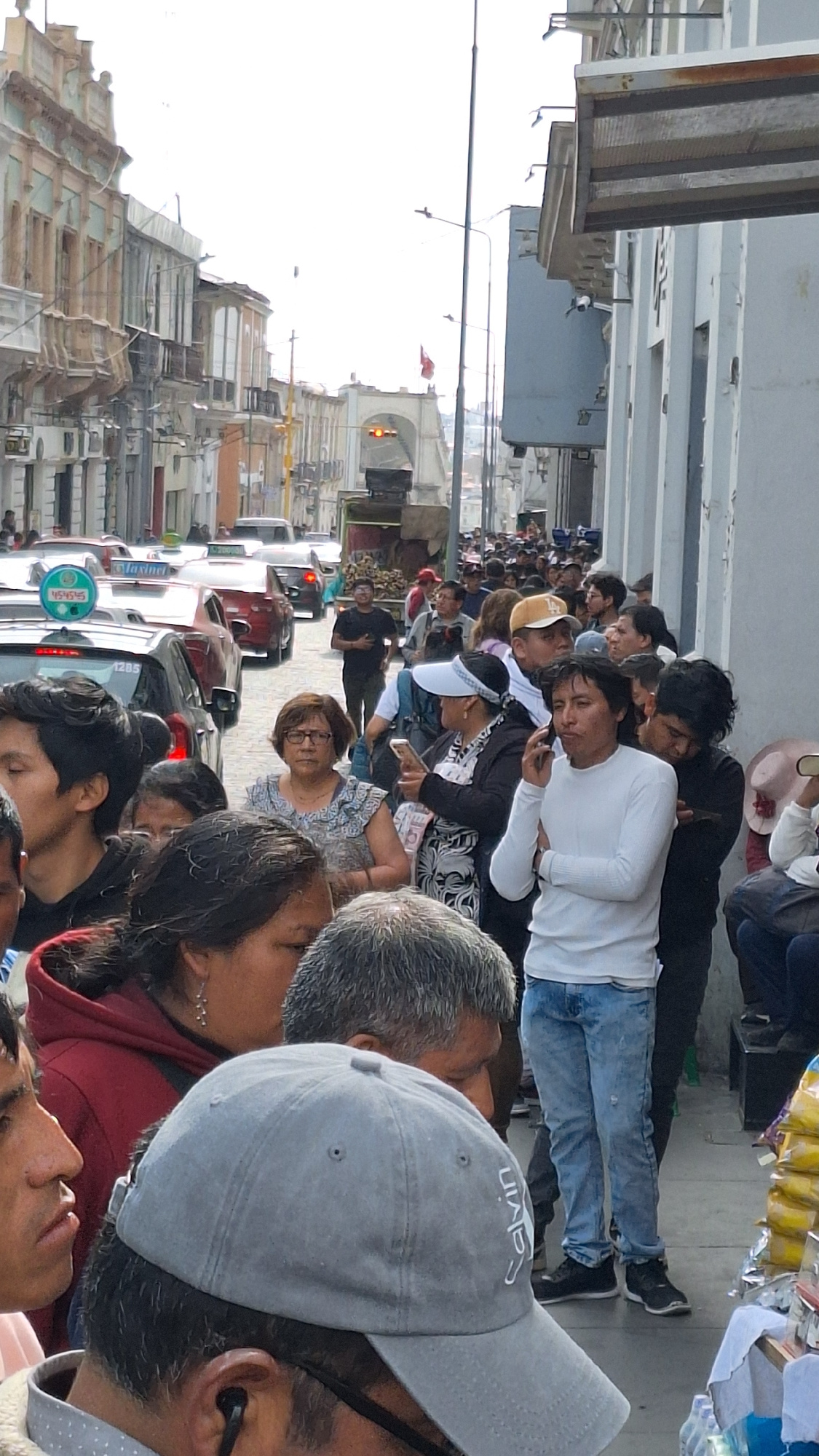 The image captures a crowded street scene in Arequipa, Peru. A large group of people are standing closely together on a sidewalk adjacent to a street with slow-moving car traffic. The pedestrians appe…read more