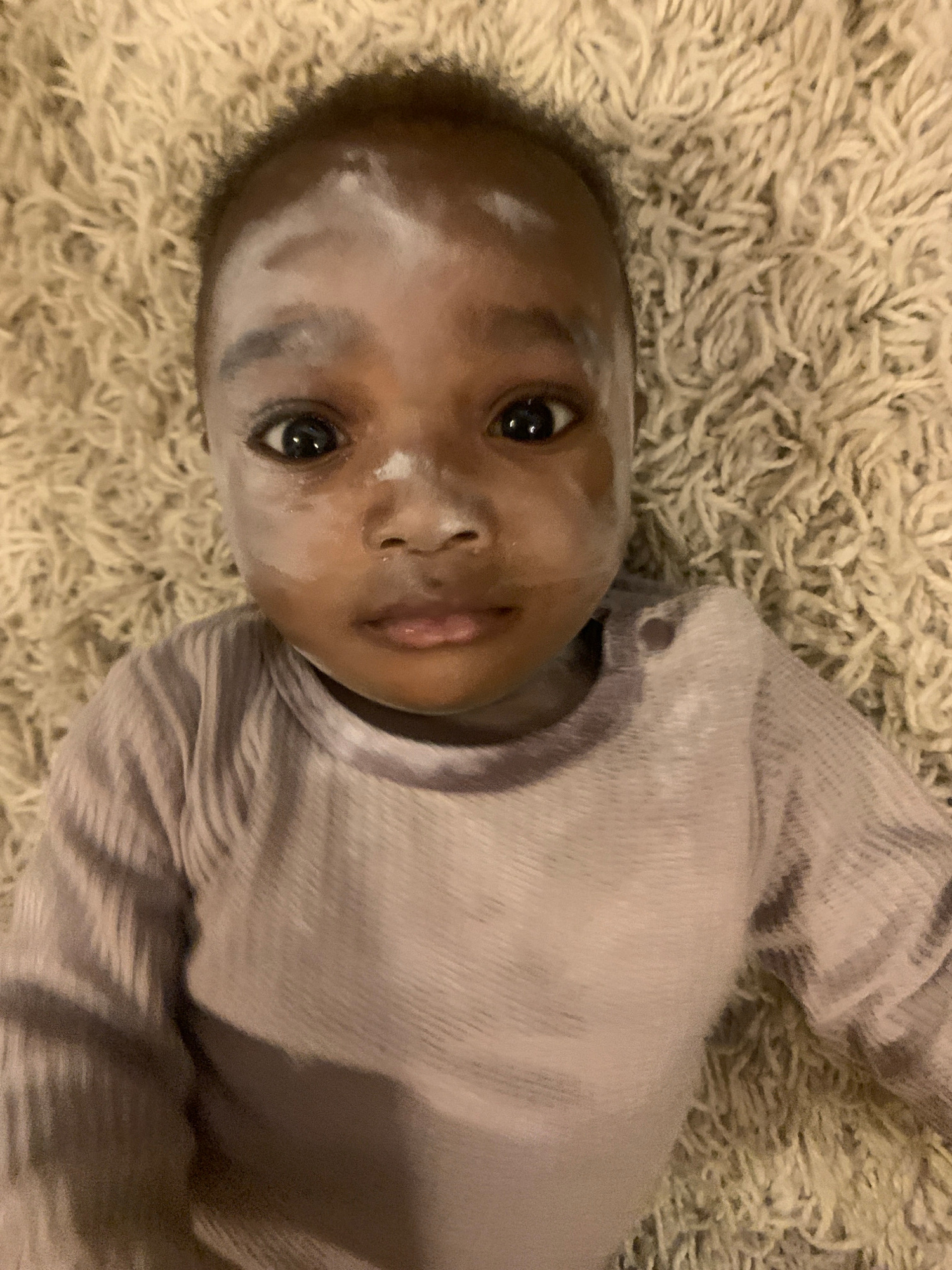 A close-up, tilted view shows a baby lying on its back on a beige, shaggy rug. The baby has dark skin, brown eyes, and some white cream or ointment smeared on the forehead, cheeks, and around the eyes…read more