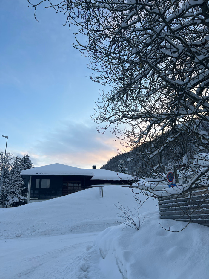This image depicts a snow-laden winter scene in a residential or semi-urban area within or on the outskirts of Tromsø, Norway. The sky is a gradient of light blue, transitioning to pale pink and orang…read more