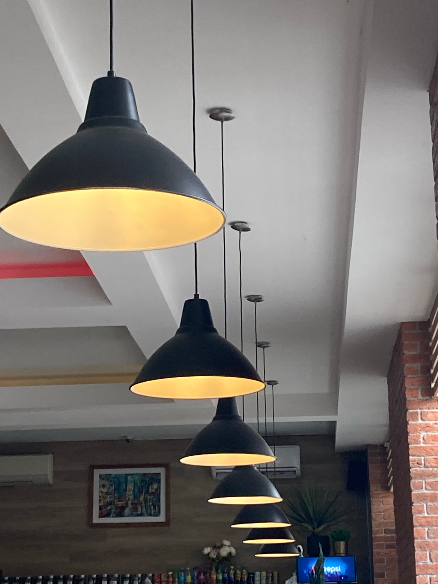 The image shows a row of pendant lights with black shades and gold interiors, hanging from wires against a white wall. The location appears to be an interior space, possibly a restaurant or cafe, with…read more