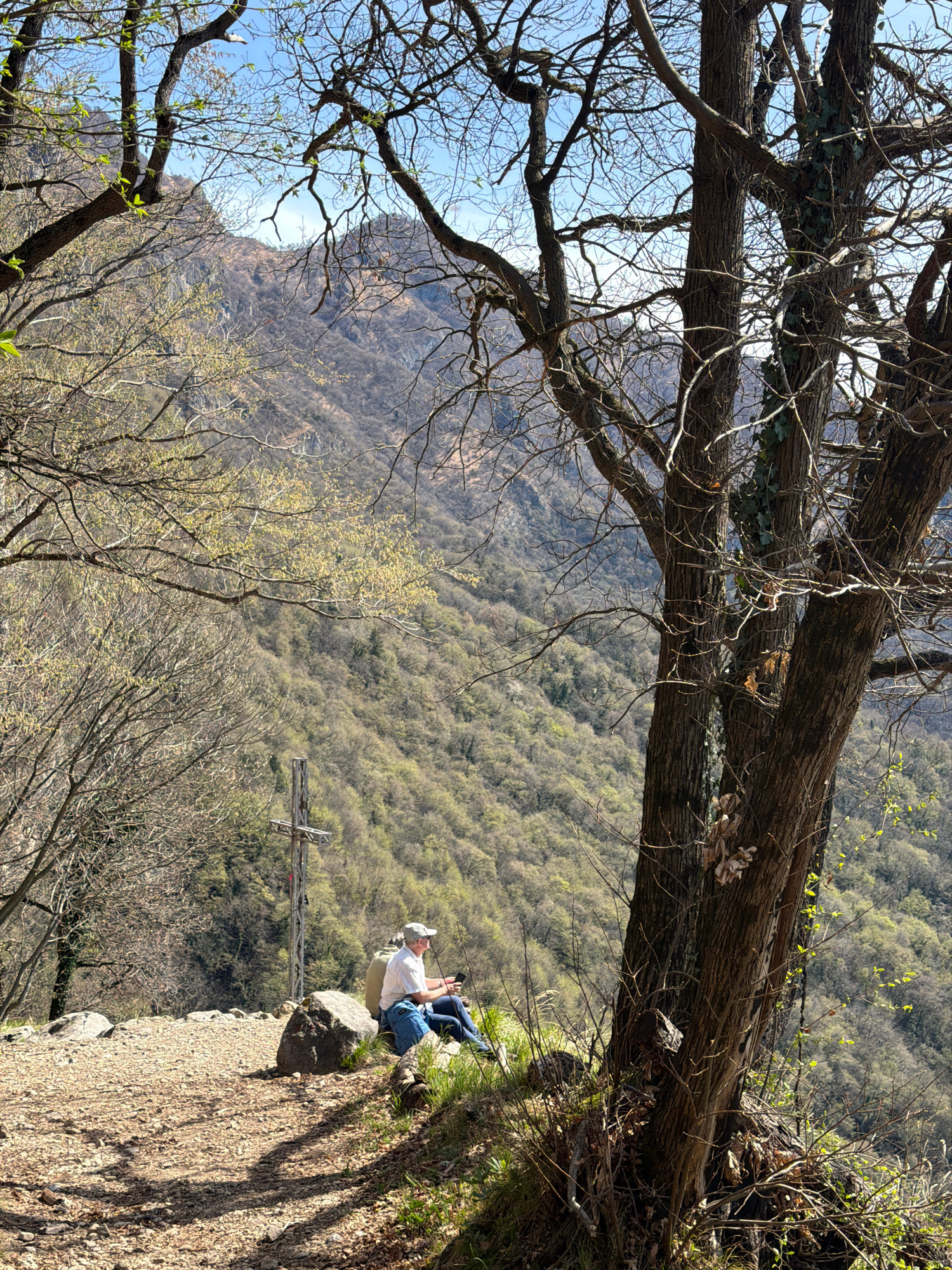 A man sits on a rocky outcrop overlooking a mountainous landscape in Lierna, Italy. He is wearing a white shirt, blue jeans, and a light-colored baseball cap. He is holding a phone in his hands, appea…read more