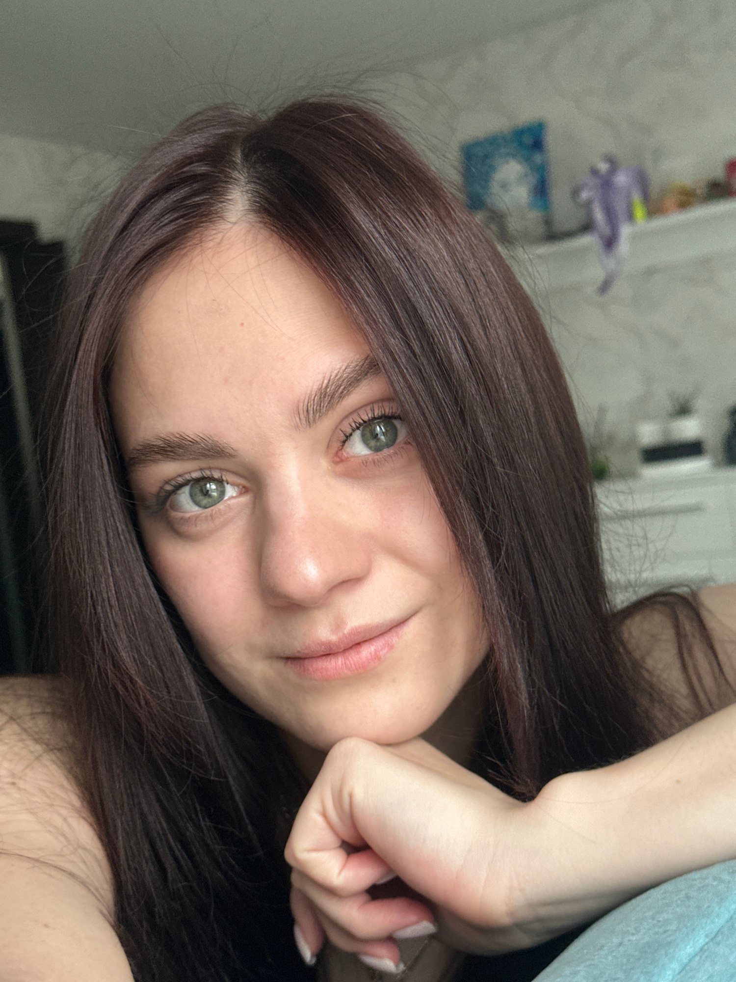 A young woman with long, dark brown hair and green eyes is captured in a close-up, diagonal selfie. Her face, framed by her hair, looks directly at the camera with a gentle, slight smile, conveying a…read more