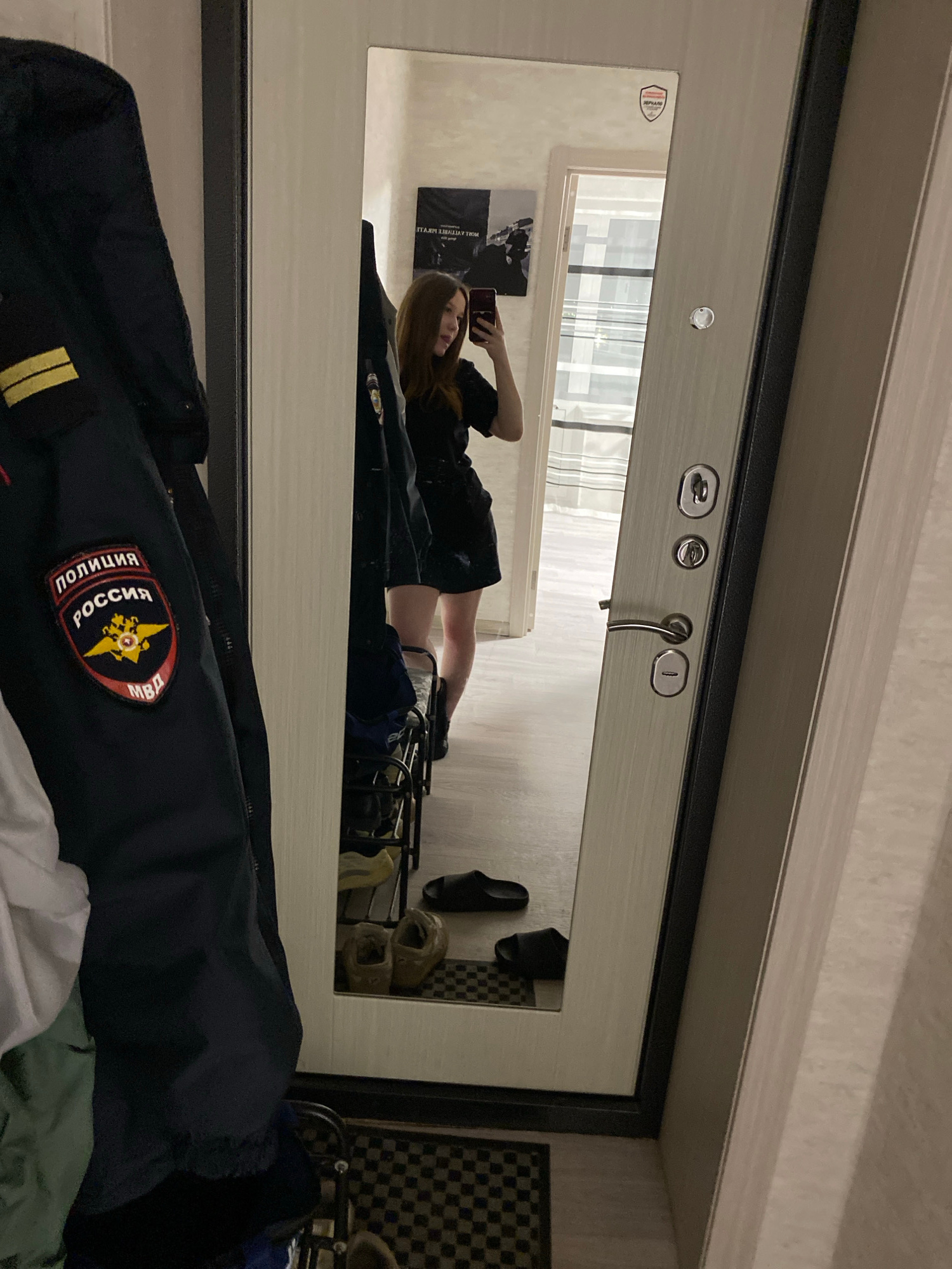 The image shows a mirror reflection of a young woman with long brown hair, lying down and taking a selfie with her phone. She is wearing a dark shirt and shorts. Behind her in the reflection is a wind…read more