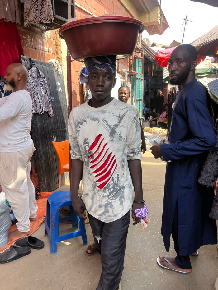 This image depicts an outdoor market scene in Abuja, Nigeria, under bright daylight conditions. A young Black male stands centrally, looking directly forward, balancing a large, dark red plastic basin…read more