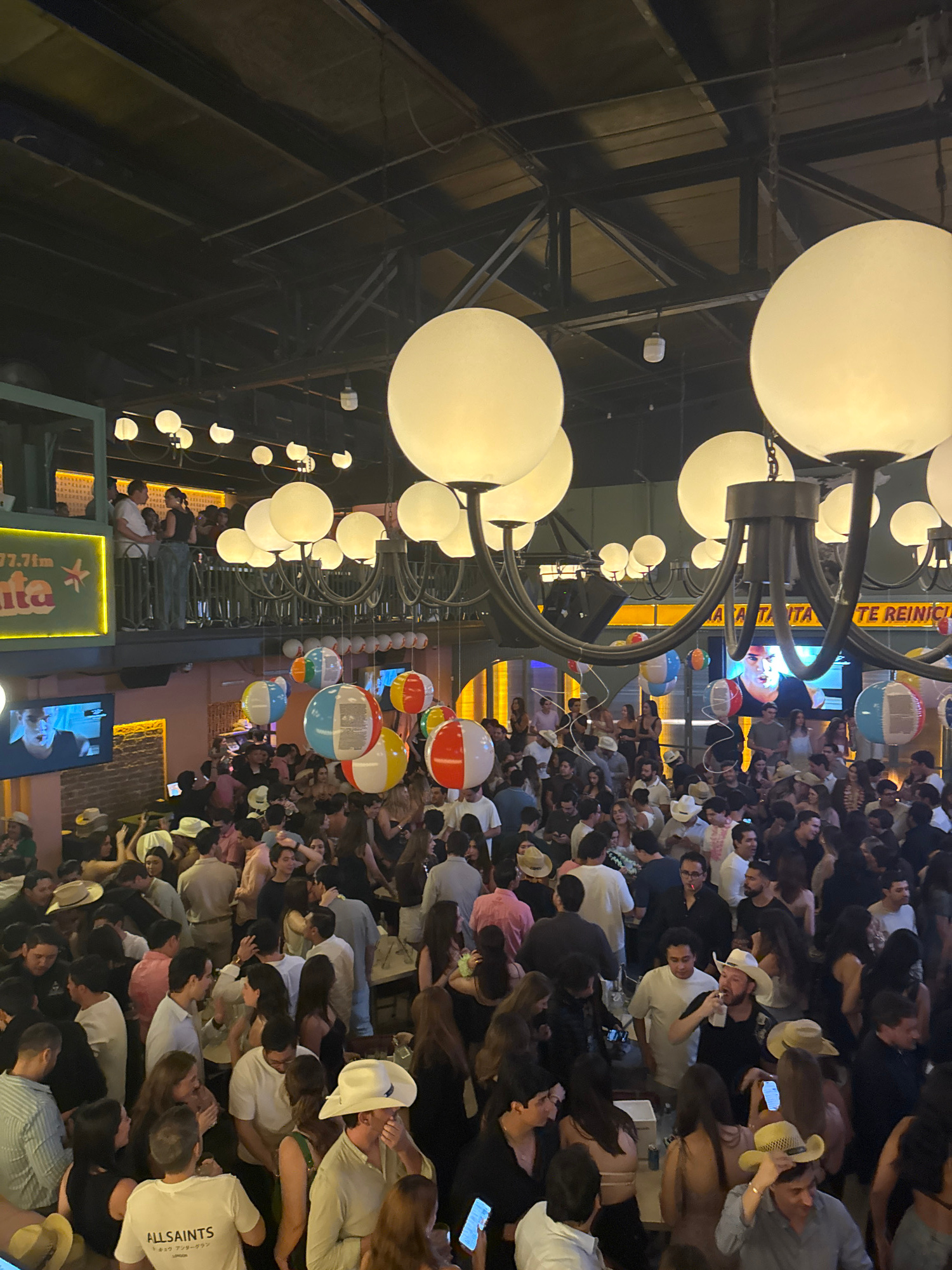 The image depicts a crowded indoor venue, potentially a bar or a nightclub, in León, Mexico. A dense crowd of people fills the space, with some wearing hats. There are many beach balls, possibly as de…read more