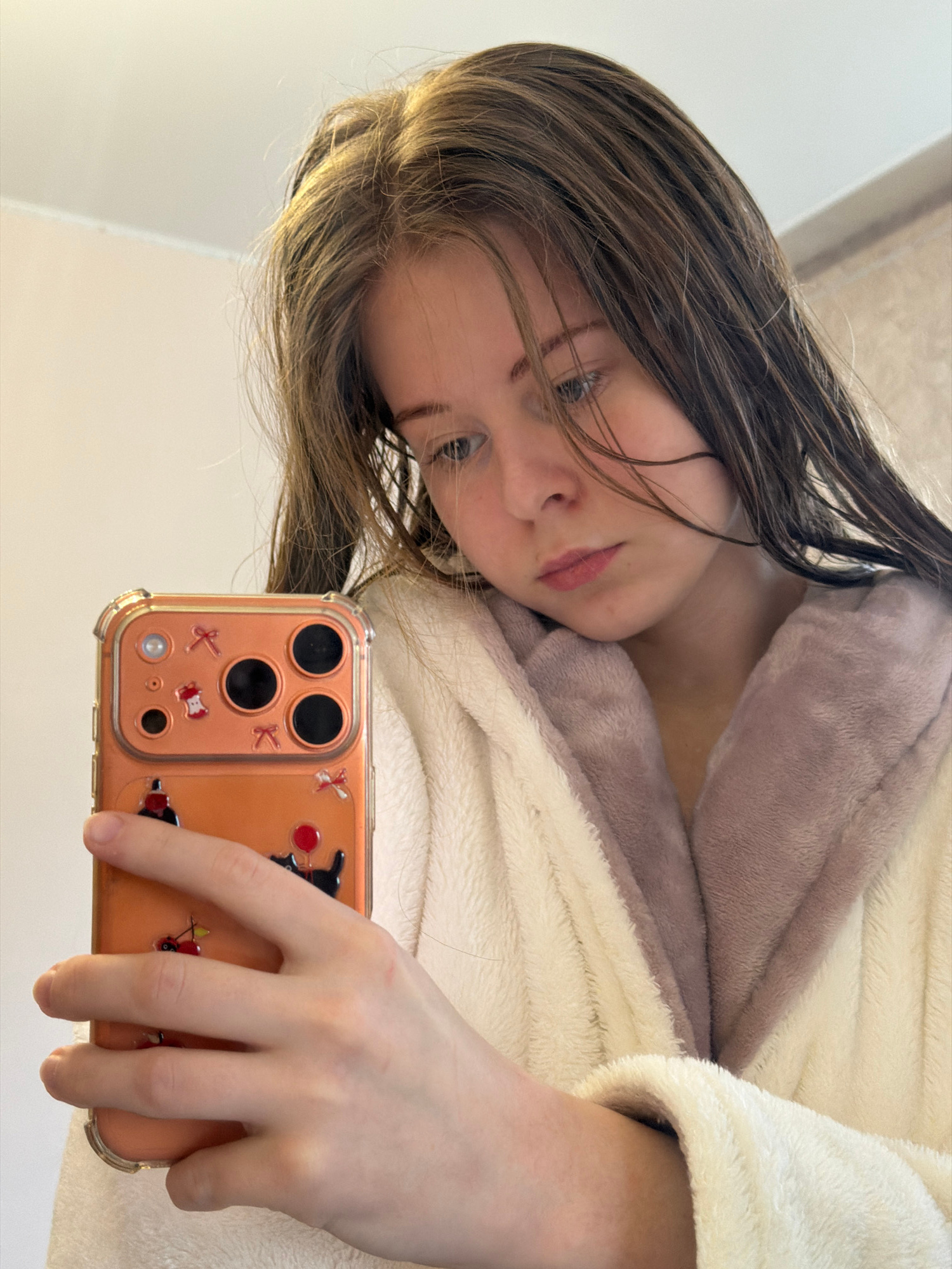 This mirror selfie captures a young individual, likely female, with long, damp brown hair, wearing a cozy cream-colored fluffy bathrobe with a light brown interior. She has light-colored eyes and a so…read more