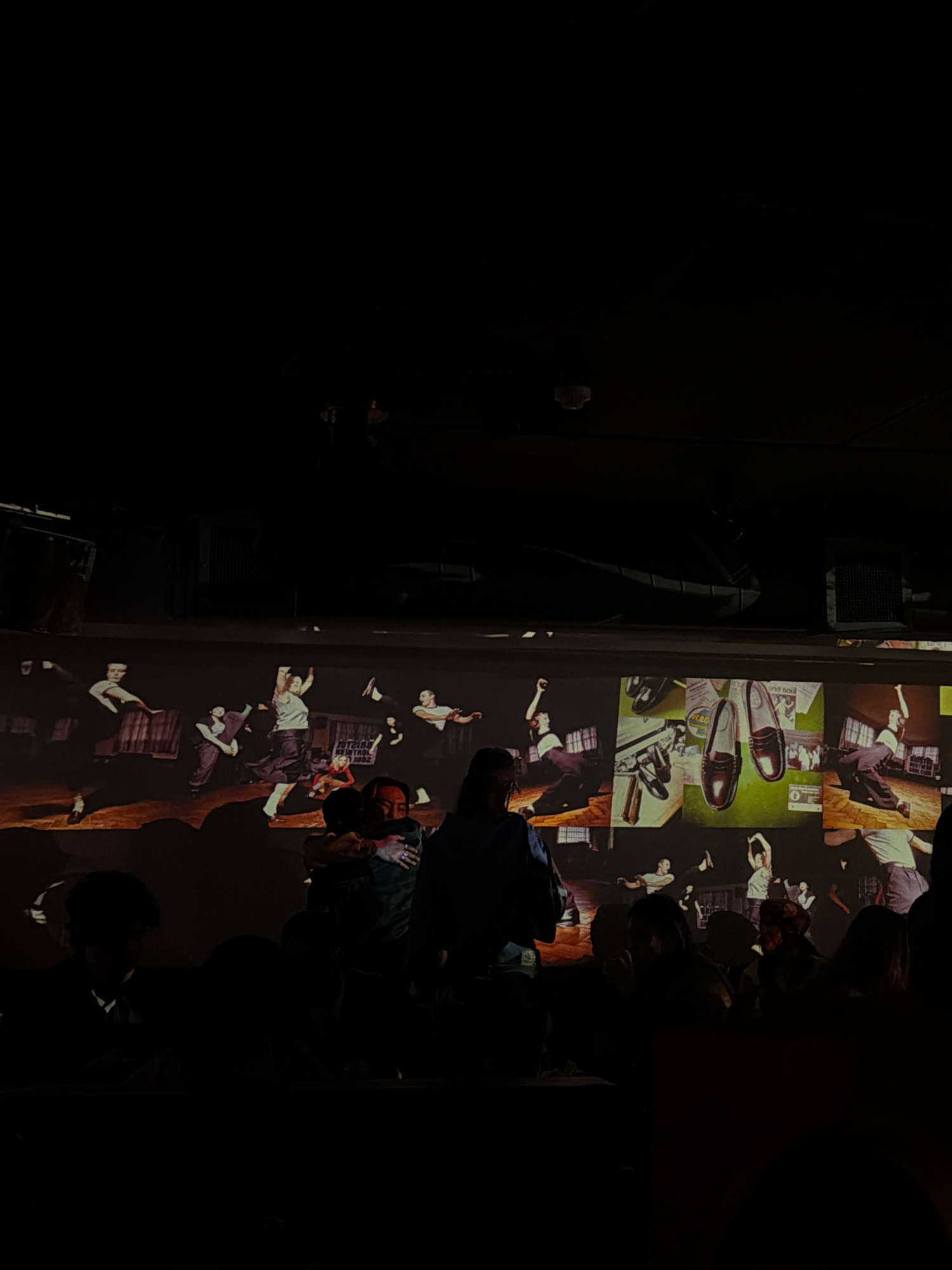 A low-light, indoor scene depicts a group of people watching a projected display. The projection features images reminiscent of a stylized fashion shoot or advertisement, presenting figures in dynamic…read more