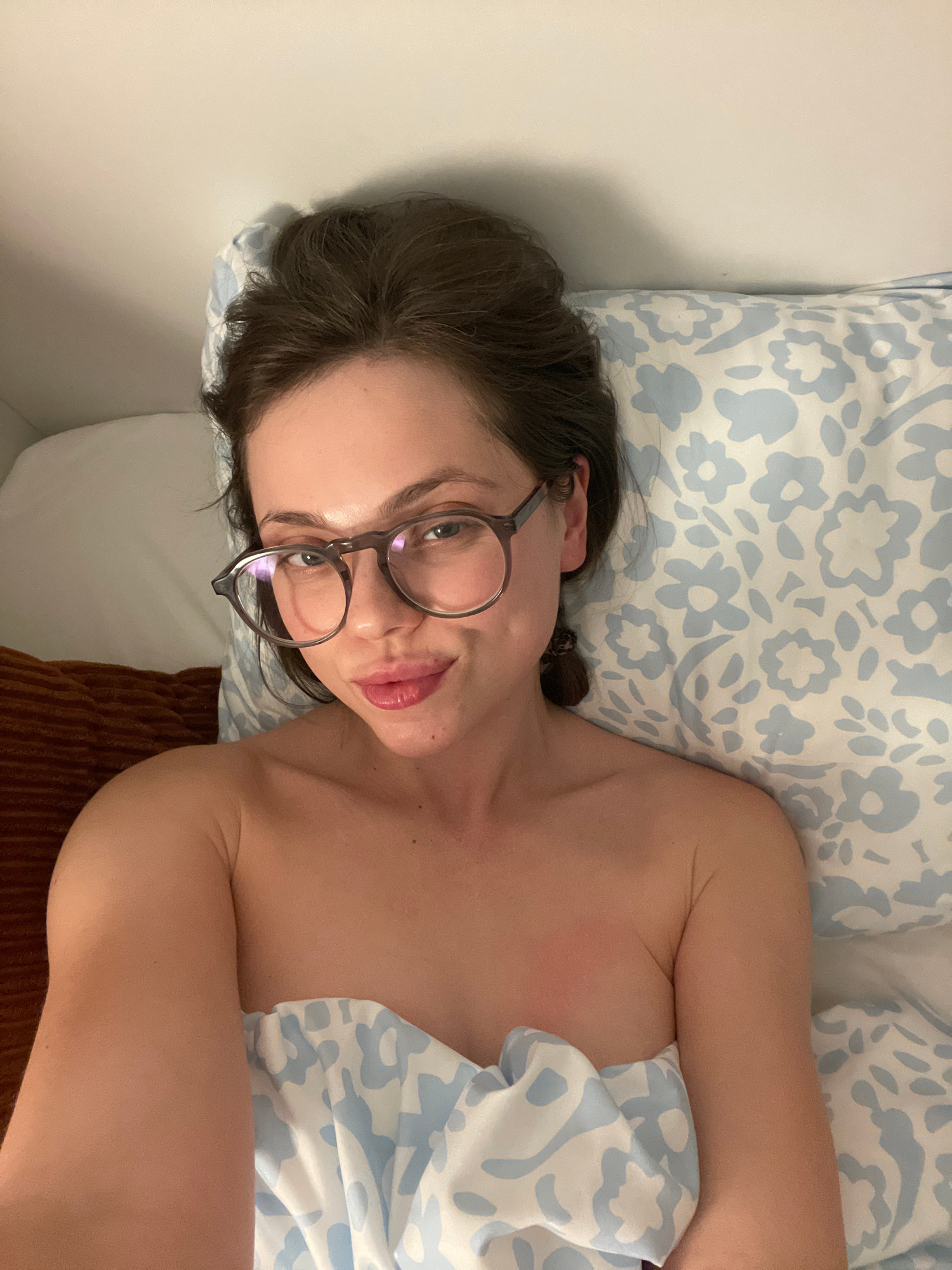 A woman lies in bed, wearing glasses, partially covered by a blue and white patterned blanket. She is on a patterned pillow. She is lying on a bed, a brown pillow is visible behind her back. The locat…read more
