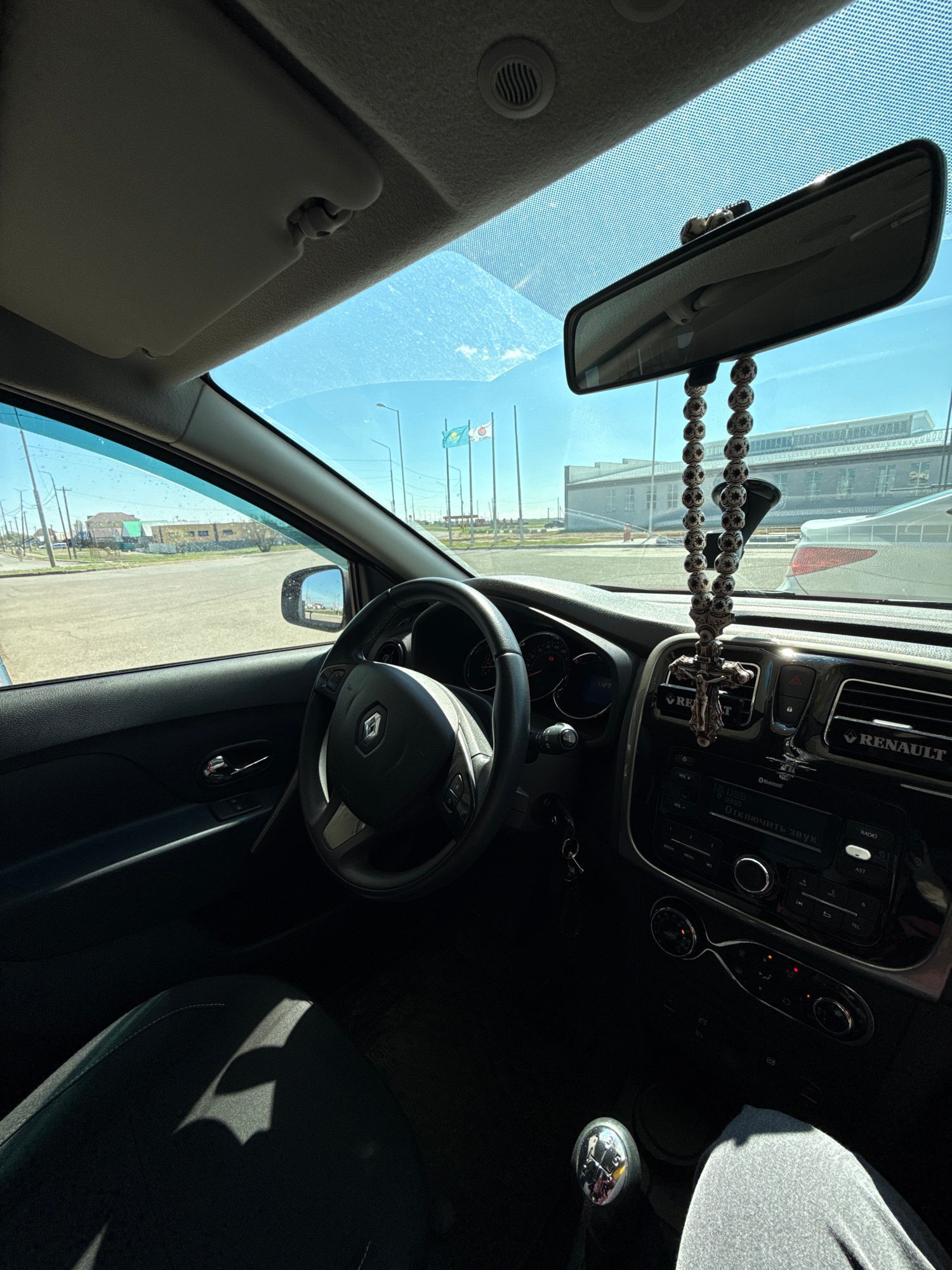 The image captures the interior of a car, primarily focusing on the driver's side and the view through the windshield, during bright daylight hours. The vehicle is identified as a Renault, with logos…read more