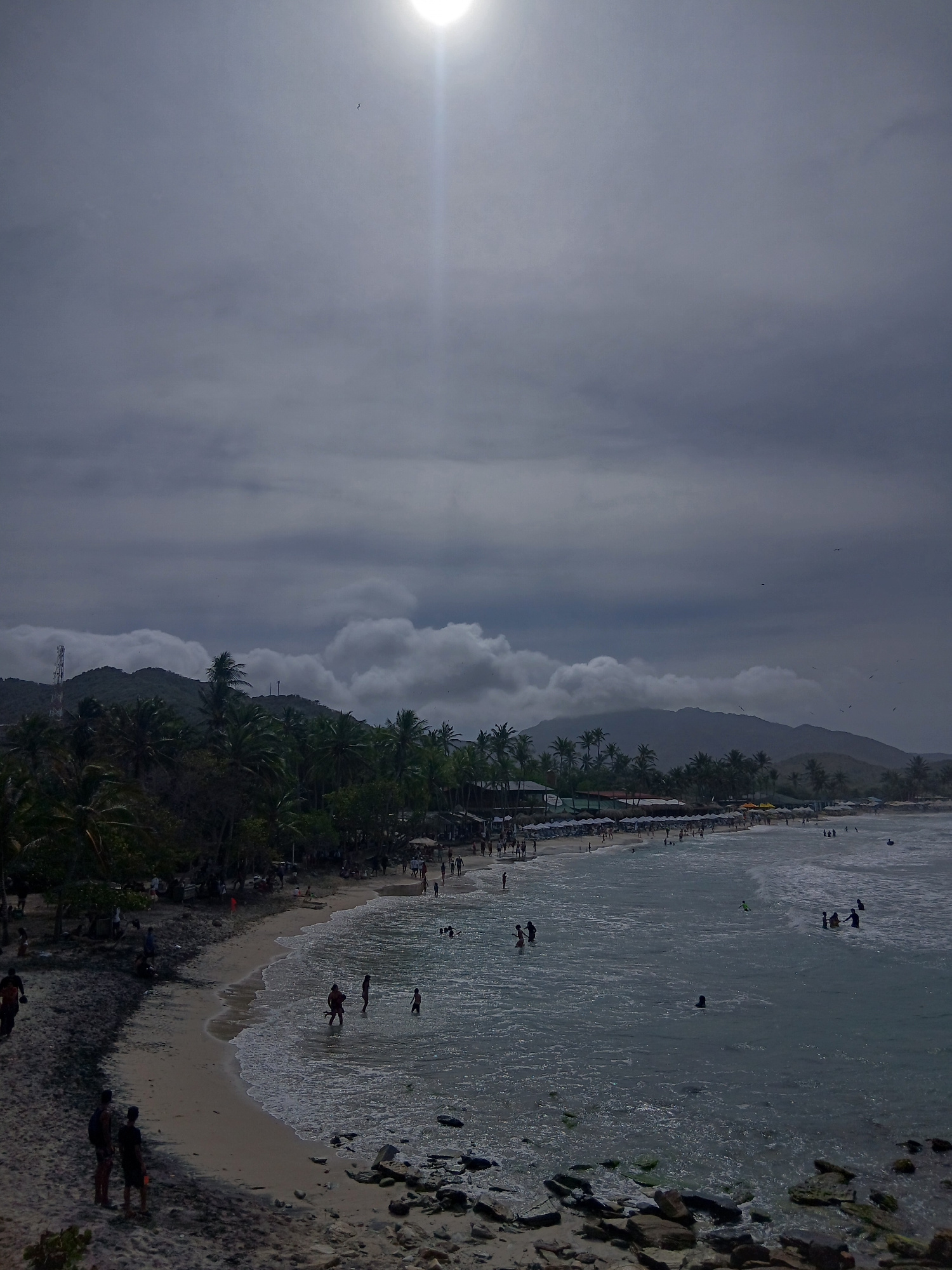 The image captures a view of Playa Parguito in Venezuela. A beach lined with palm trees meets the ocean, where people are swimming and wading in the water. The beach has a sandy area where people are…read more