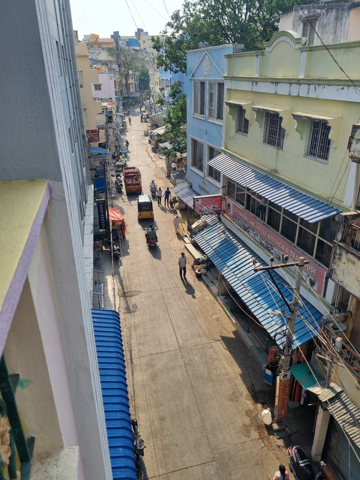A high-angle shot captures a street scene in Puttaparthi, India. The street is lined with buildings, some painted in light shades of yellow and blue. The buildings have corrugated metal awnings and si…read more