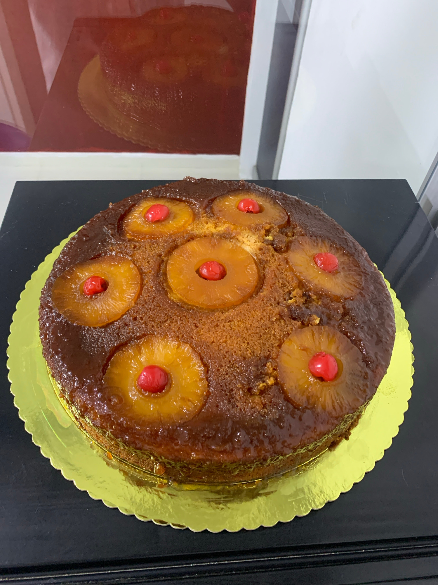 The image depicts a pineapple upside-down cake on a gold-colored, scalloped-edged cake board. The cake is topped with glazed pineapple rings, each adorned with a red cherry in the center. The cake sit…read more