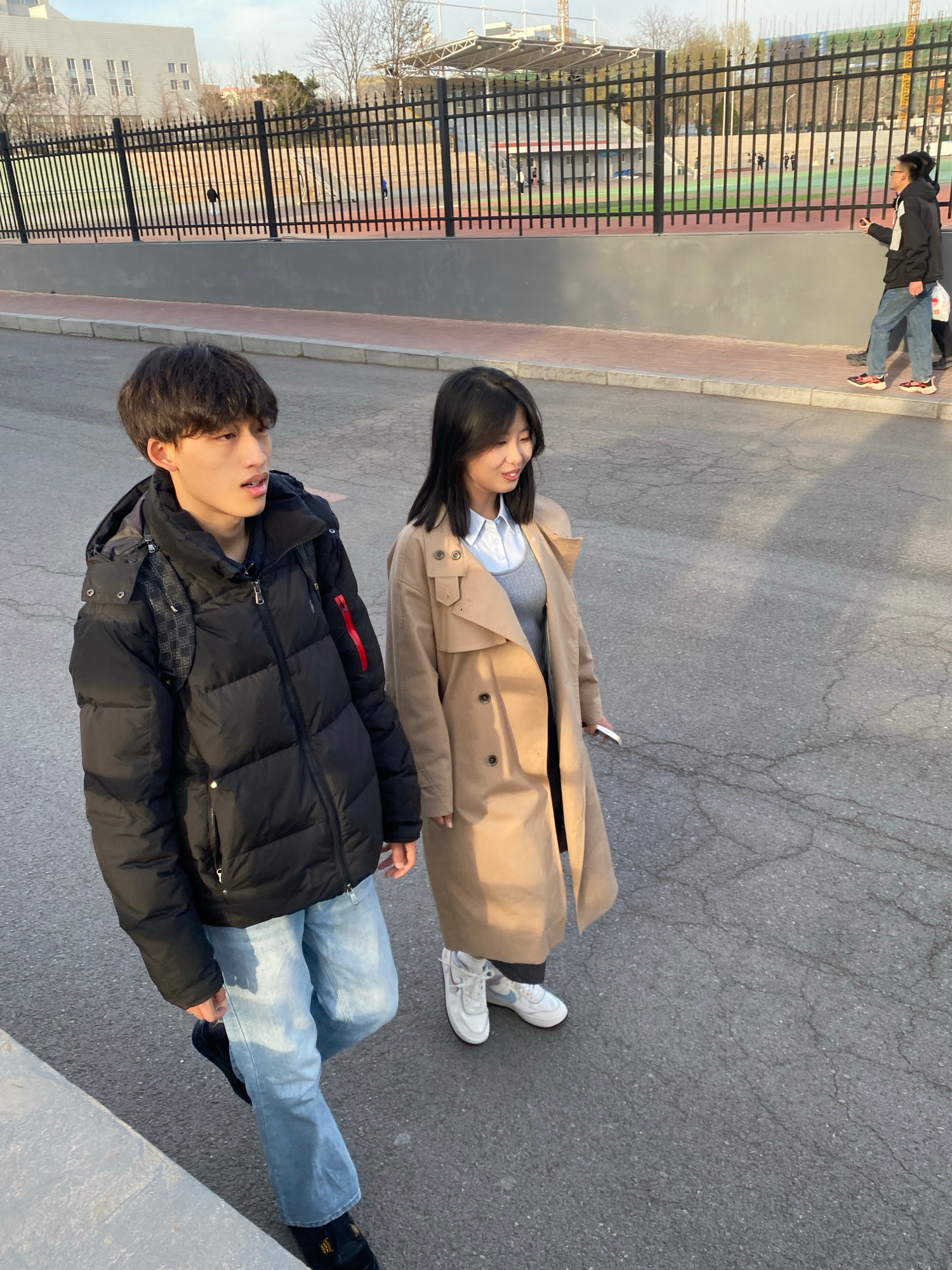 A medium-shot outdoor photograph shows a young woman and a young man standing on a paved surface near a fence. The woman is wearing a long, beige trench coat over a light-colored shirt and white sneak…read more