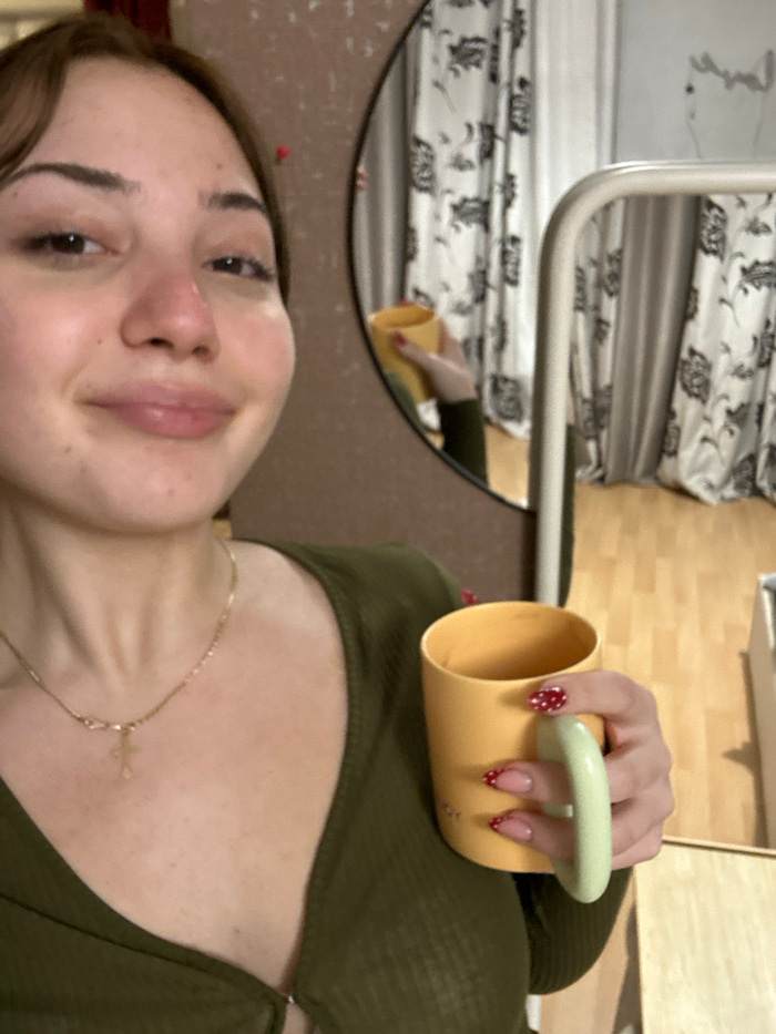 A woman with fair skin, a gold necklace, and dark hair looks directly at the camera. She holds a yellow mug with red polka dot nails. The mug has a light green handle. A round mirror is behind her wit…read more