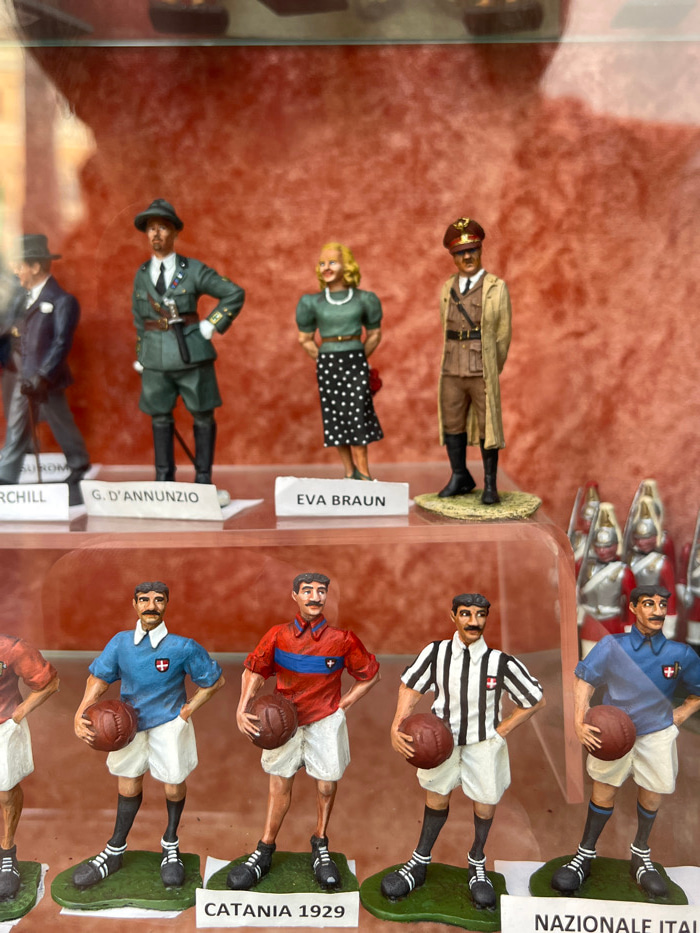 A photograph captures a segment of a display case featuring miniature historical and sports figurines. On the upper shelf, four prominent figures are depicted. From left to right: A partially visible…read more