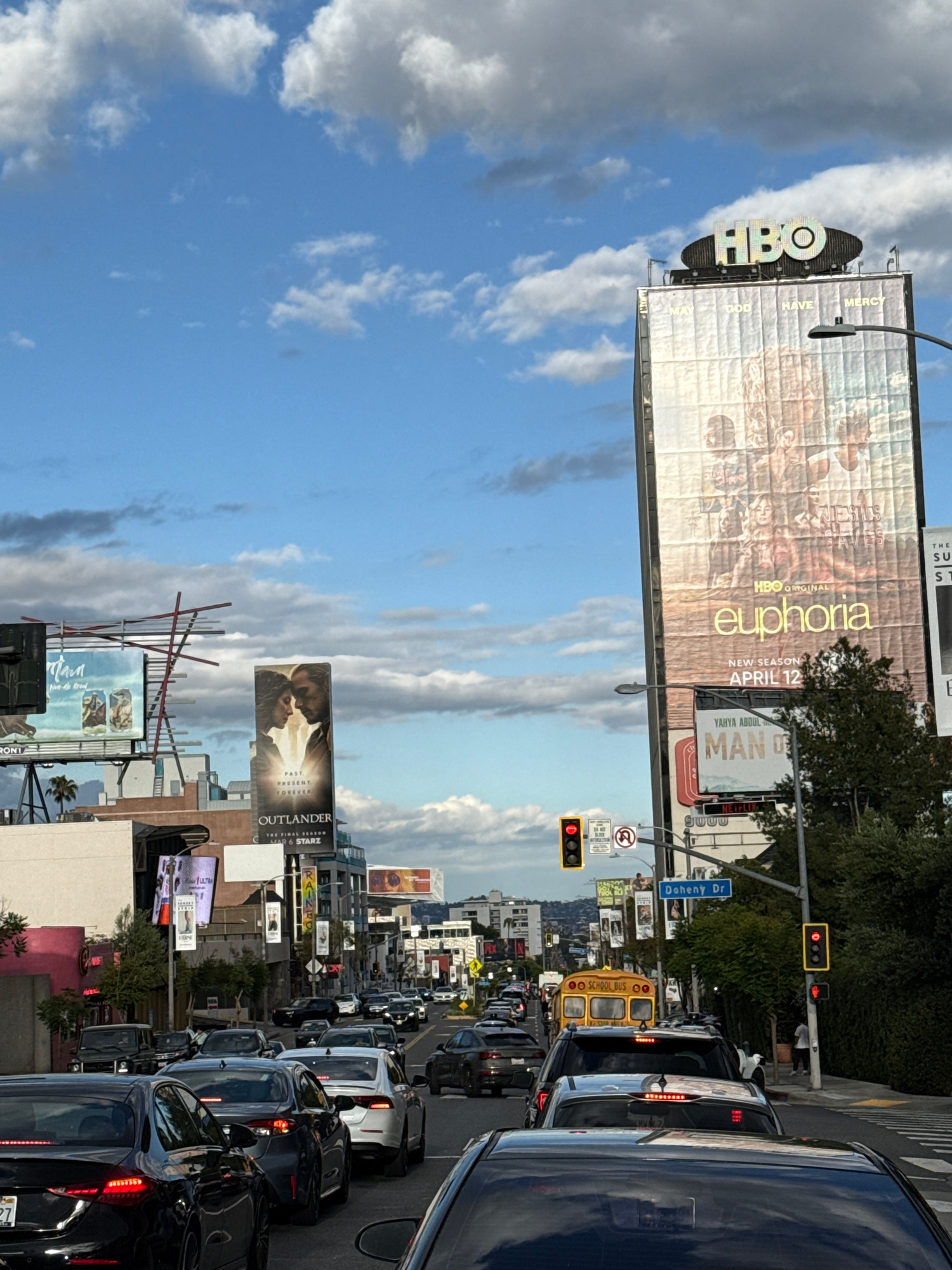 The image shows a street in West Hollywood, United States of America, densely packed with stationary traffic. Several large billboards are visible on either side of the street, advertising programs liβ¦read more