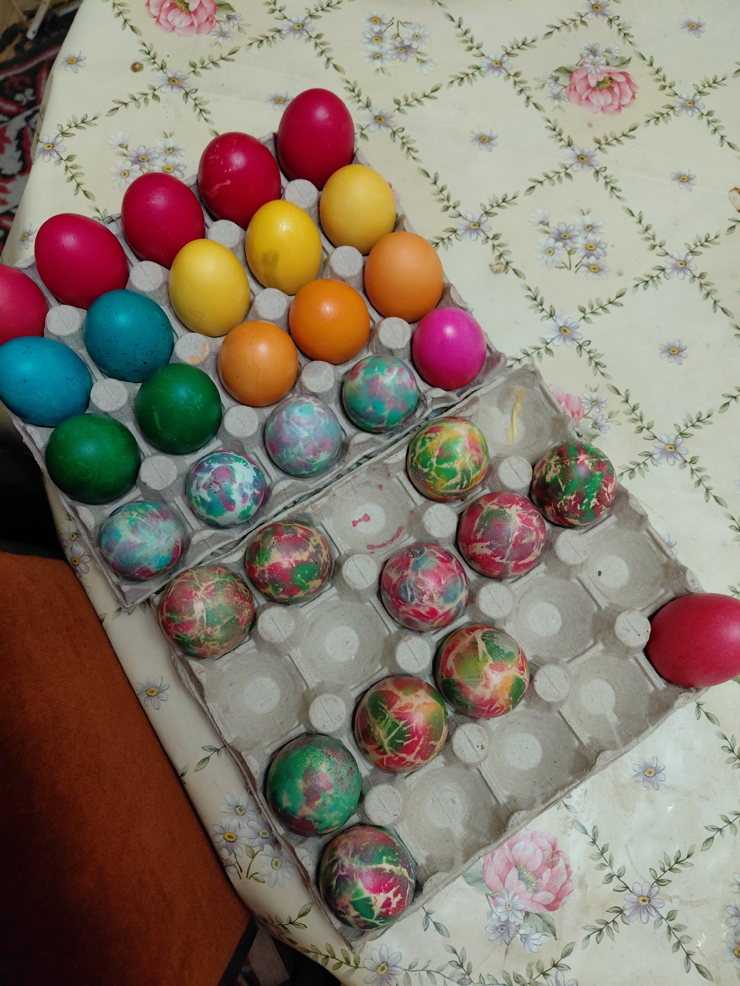 Two open egg cartons sit on a surface covered with a light floral pattern. One carton contains easter eggs, arranged in rows of red, yellow, orange, pink, green, and blue. The other carton holds red-m…read more