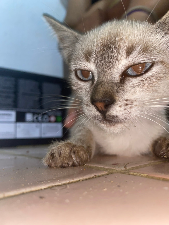 A tan and white cat with blue and brown eyes is close to the camera. Its head is tilted toward the right side of the frame. The cat's front paws are visible, with one appearing to press against a tan…read more
