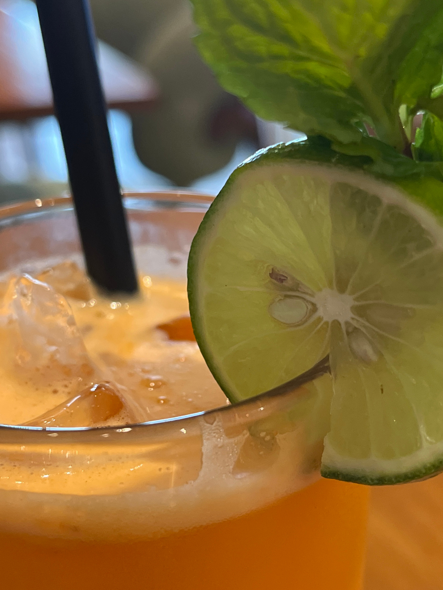 A close-up photograph shows a glass of iced tea, garnished with a lime slice and mint sprig. A black straw extends into the glass. The iced tea is an orange color with ice visible inside the glass. Thβ¦read more