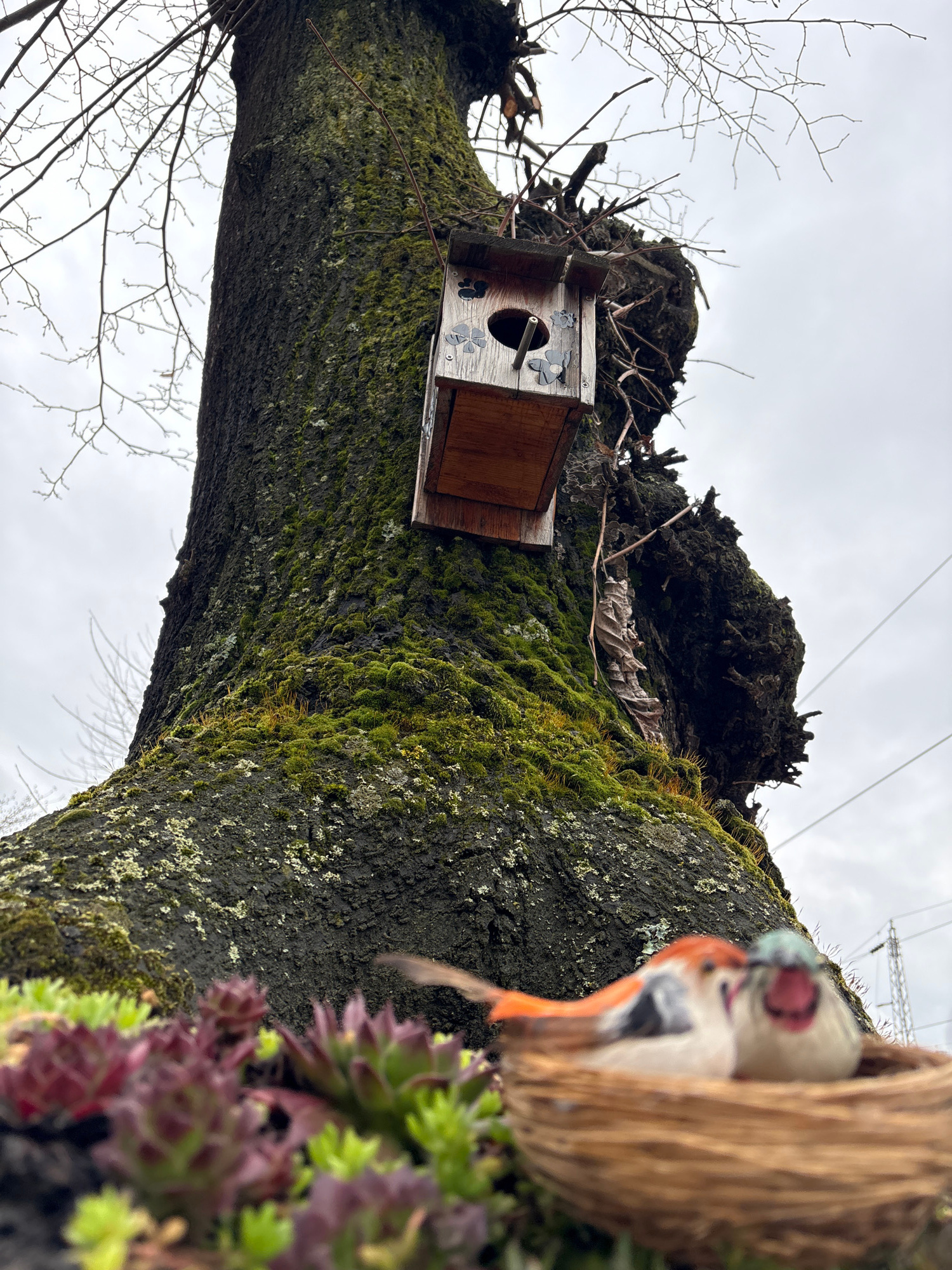 The image depicts a tree in Tryavna, Bulgaria, with two artificial birdhouses affixed to it. One is a wooden box with floral decorations, while the other is a woven birdhouse in the shape of a teardro…read more