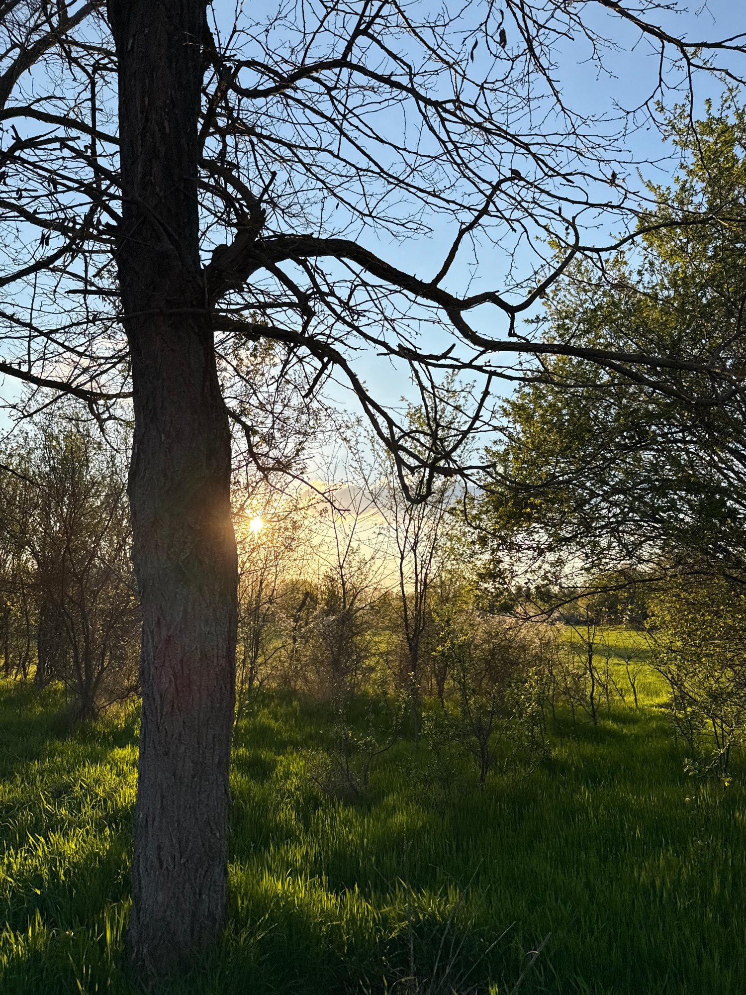 The image is a landscape taken from a low angle, possibly near ground level, with a tilted perspective. In the foreground, a thick tree trunk dominates the view, silhouetted against the setting sun. T…read more