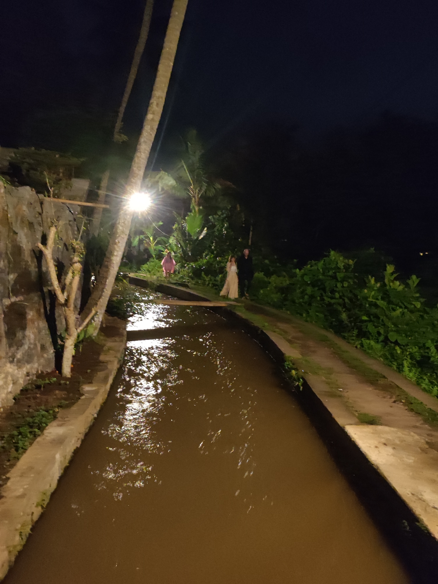 A night scene in Lokaserena, Indonesia, depicts a concrete irrigation canal filled with dark water, reflecting a nearby light source. Two individuals, one in a white dress and the other in a black sui…read more