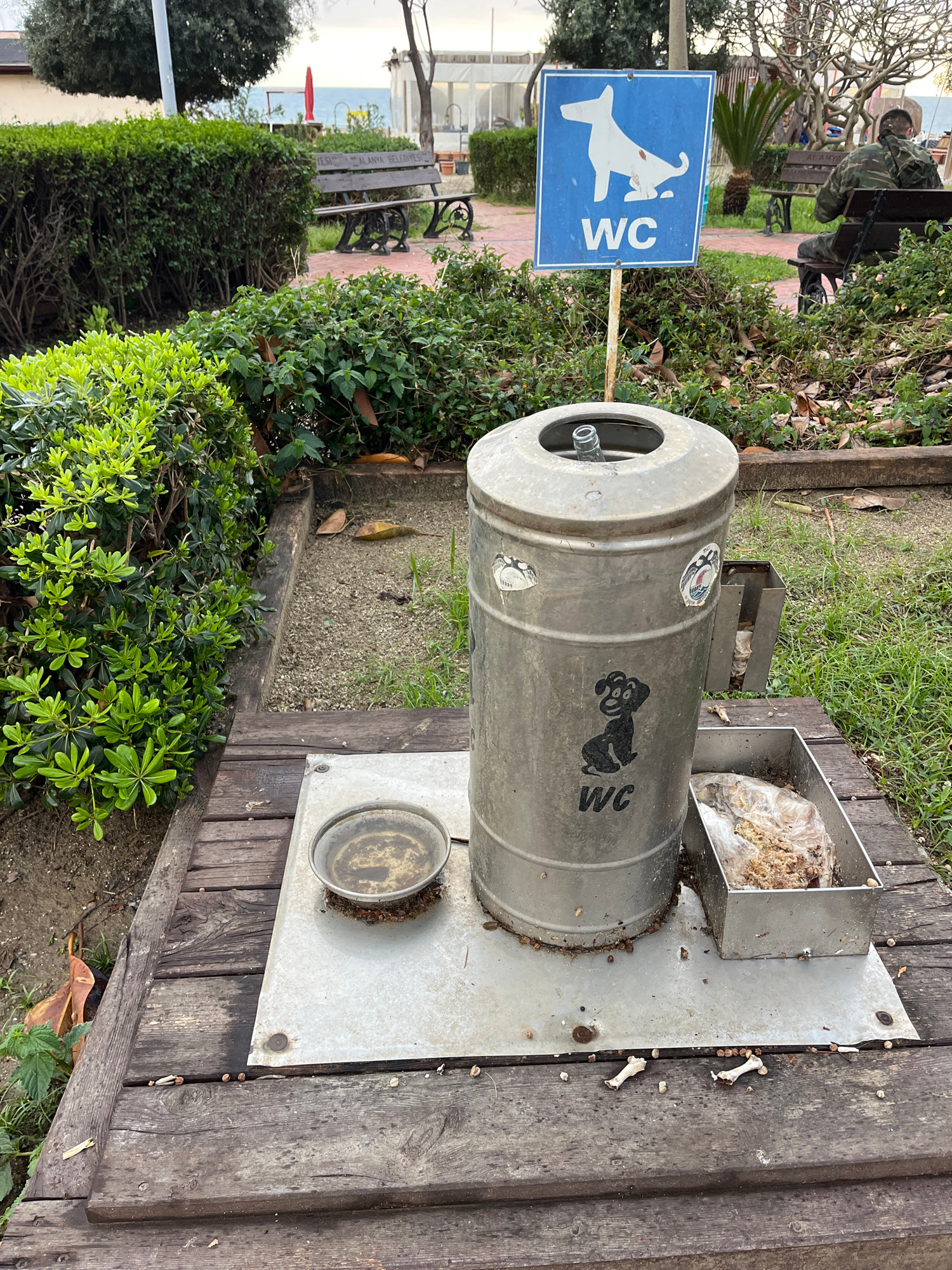 The image shows a public park scene, likely located in Alanya, Turkey, given the sign visible in the background. The central focus is a dog waste disposal station. It consists of a cylindrical metal b…read more