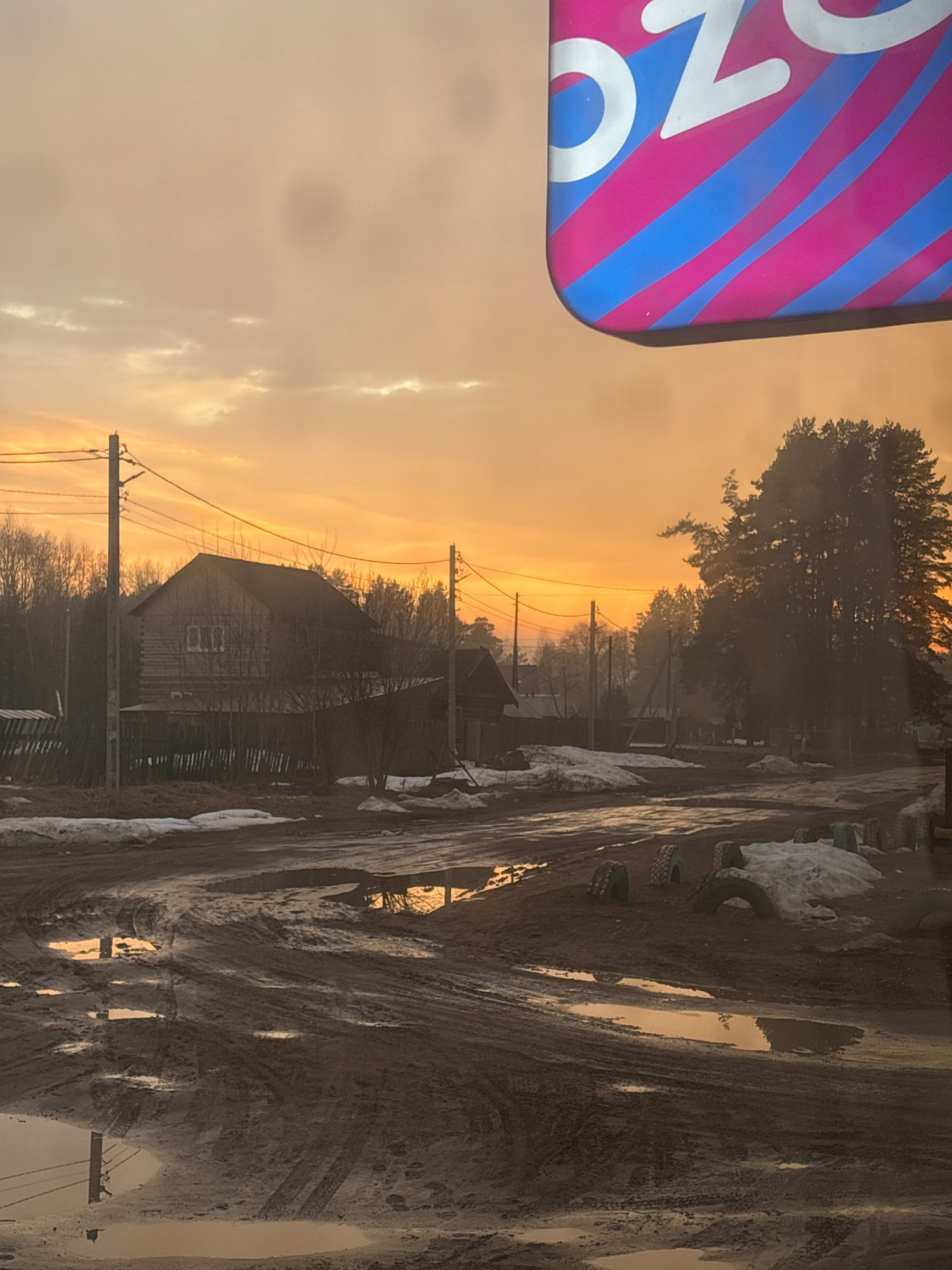 The image shows a rural street in Rusalevka, Russia, likely during or just after sunset, judging by the orange-yellow sky. The road is unpaved and muddy, with visible tire tracks and standing water. P…read more