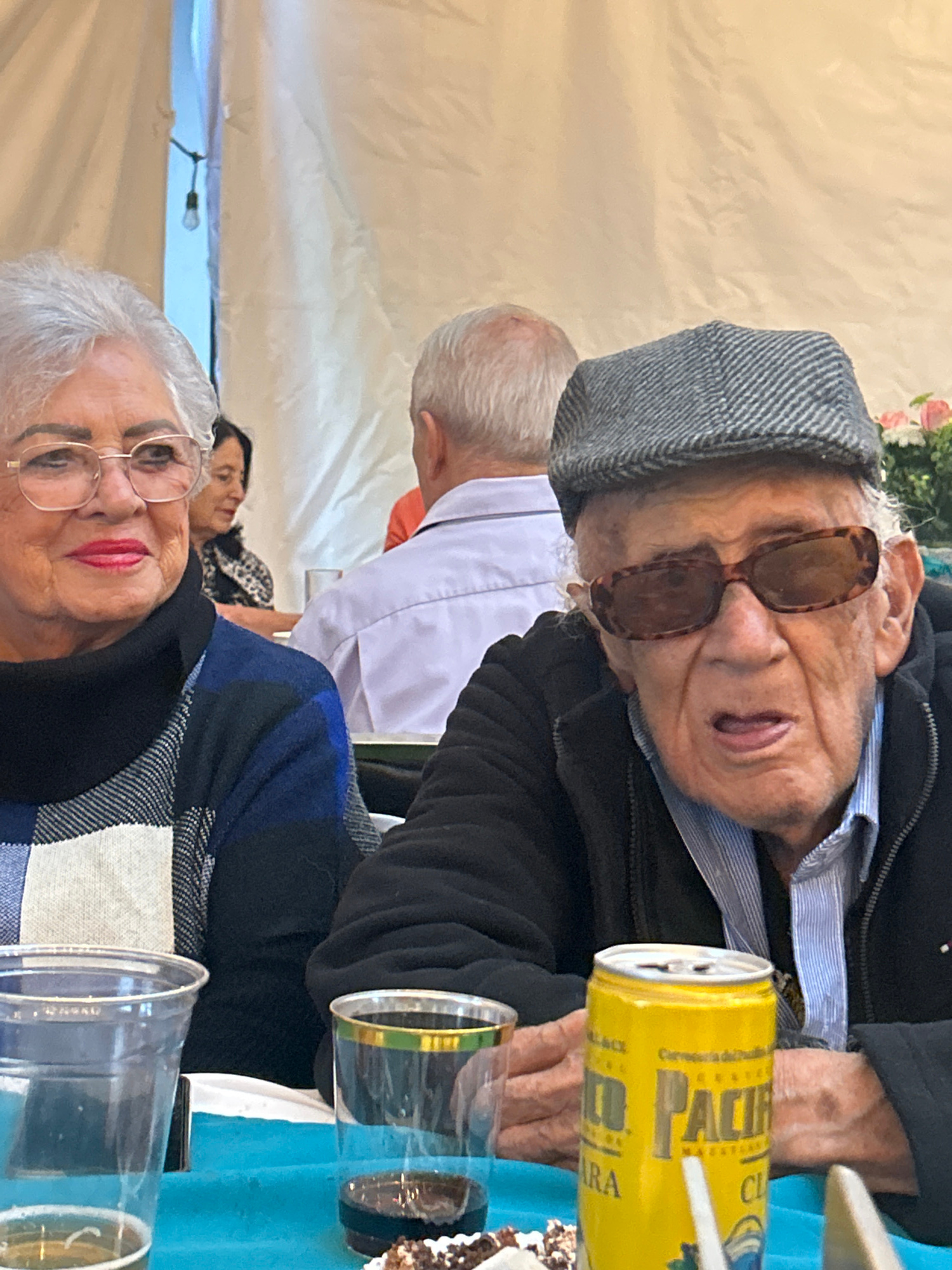 The image shows two elderly individuals seated at a table, presumably in Puebla, Mexico, based on the presence of a can of "Pacífico" beer, a brand commonly associated with Mexico. An elderly woman wi…read more