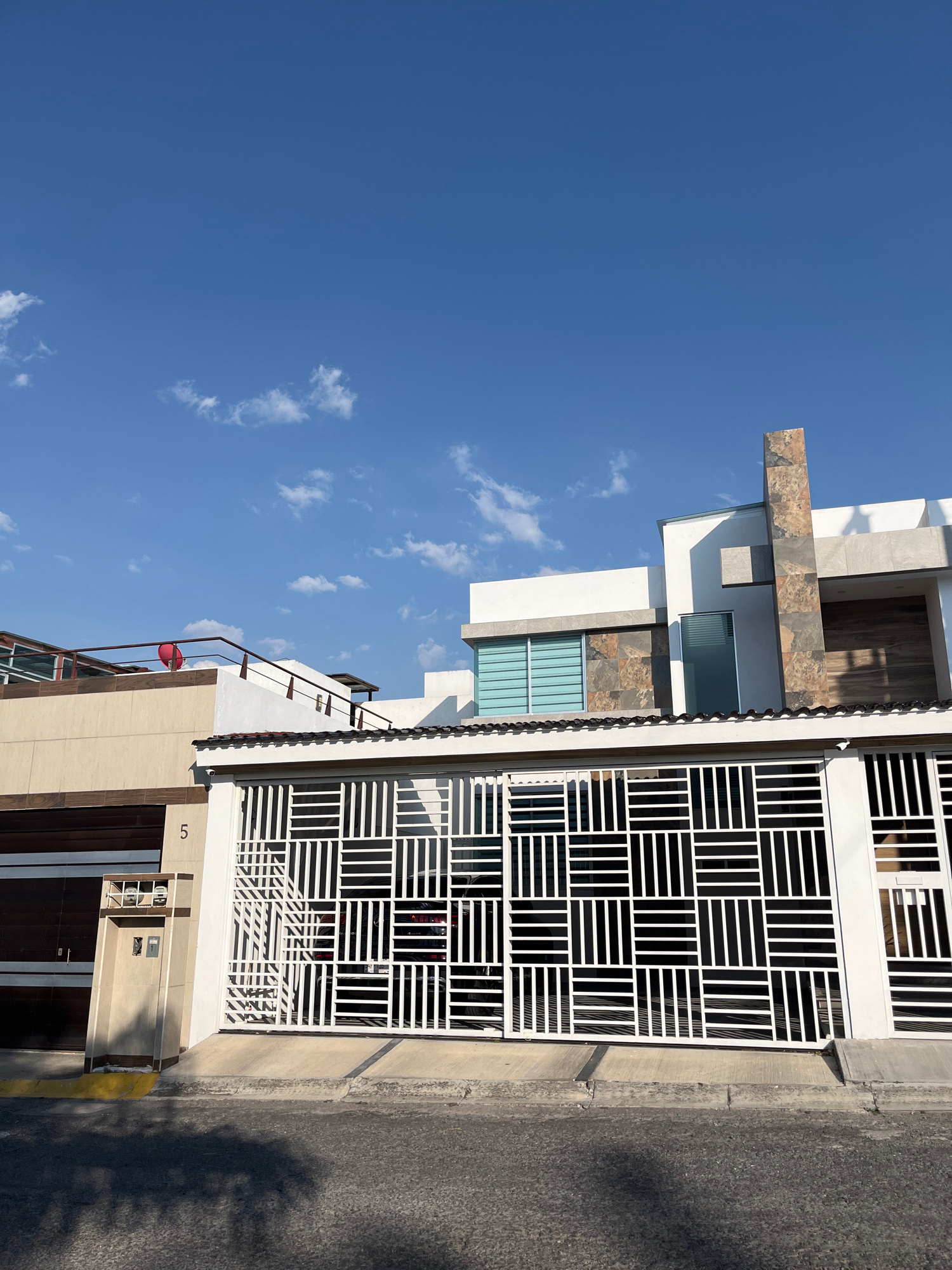 Exterior view of a modern building in San Bernardino Tlaxcalancingo, Mexico. The building features white walls, stone accents, blue-tinted windows, and a white metal gate. The gate has a grid pattern…read more