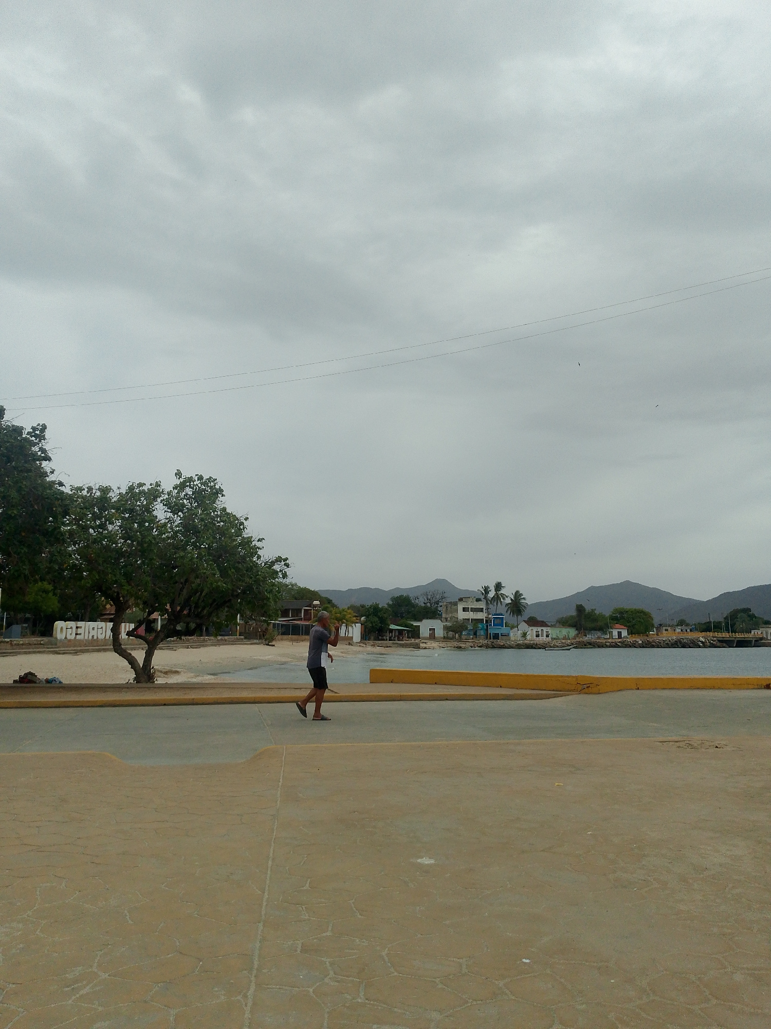 The image captures a cloudy day at the waterfront of Juan Griego, Venezuela. In the foreground, a beige stone promenade leads towards a yellow concrete barrier separating it from a sandy beach and the…read more