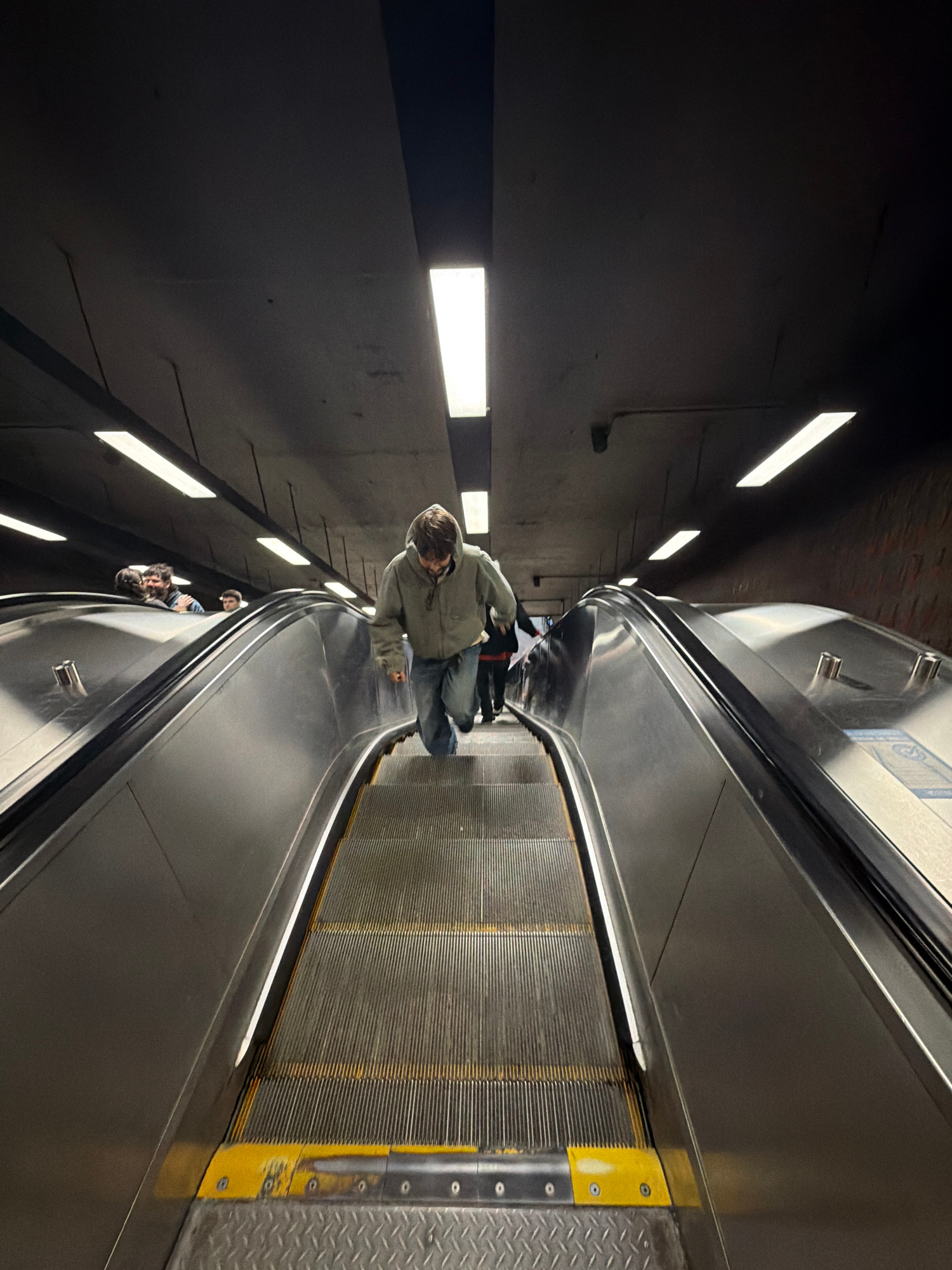 The image shows the interior of a metro station, likely in Montreal, Canada, based on the architectural style and signage. A person wearing a light-colored jacket and blue jeans is standing on an esca…read more