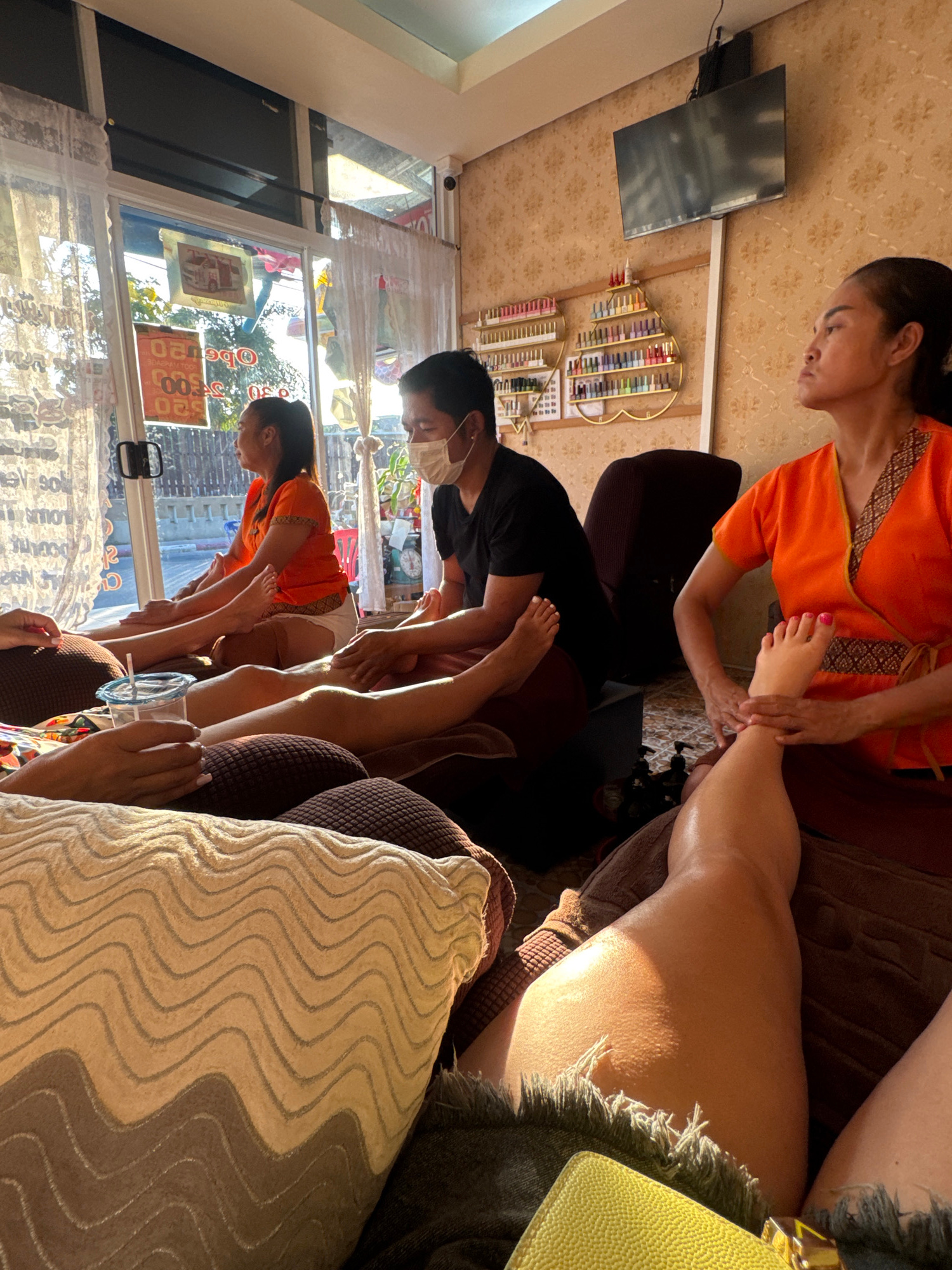 The image shows the interior of what appears to be a Thai massage business. Two masseuses wearing orange and brown patterned tops are visible. One is giving a foot massage to a customer. Another persoβ¦read more