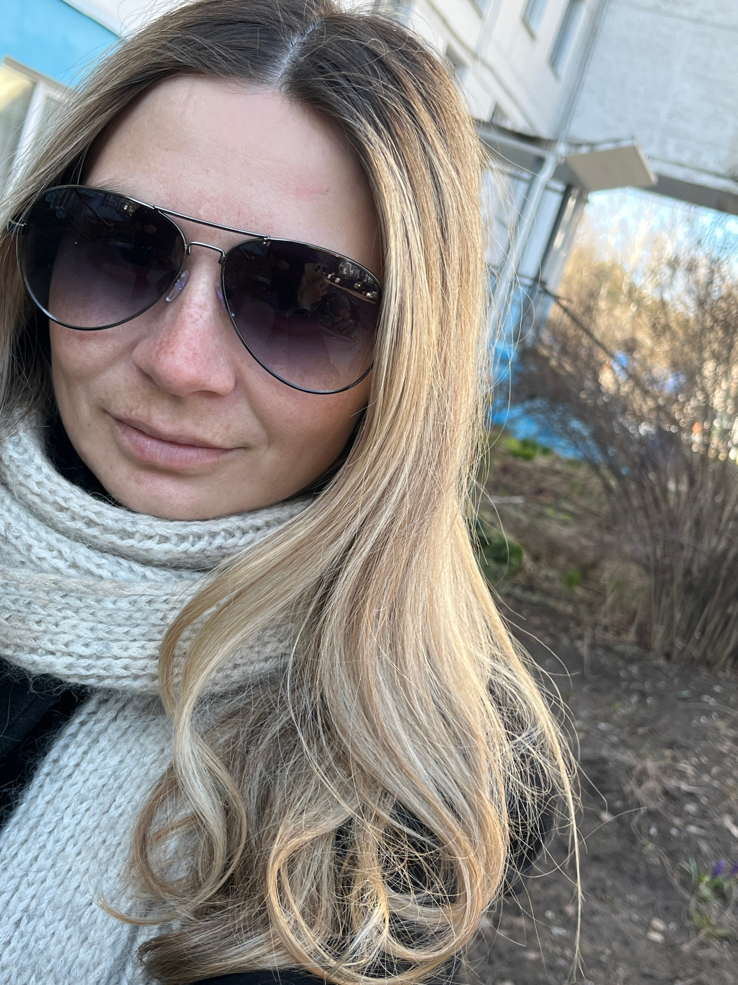The image is a close-up portrait of a woman with long, blonde hair. She is wearing sunglasses and a knitted scarf. The background is blurry and appears to be outdoors, with trees and buildings visible…read more